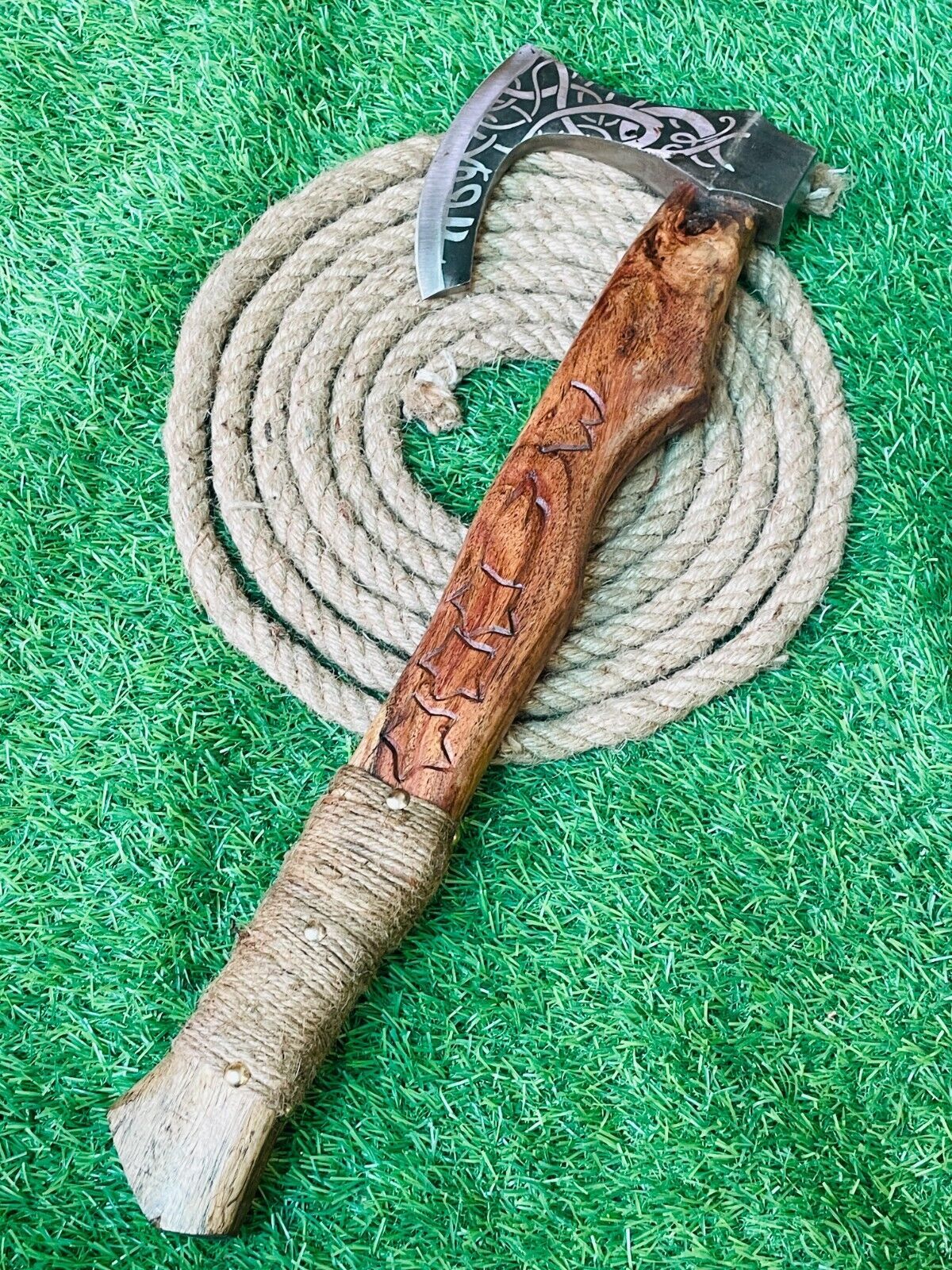 The natural wood handle ensures a firm and comfortable grip, while the included leather sheath protects the blade during transport and storage. With an overall length of approximately 23 inches, this Viking axe is balanced for effective use and looks impressive in any collection.