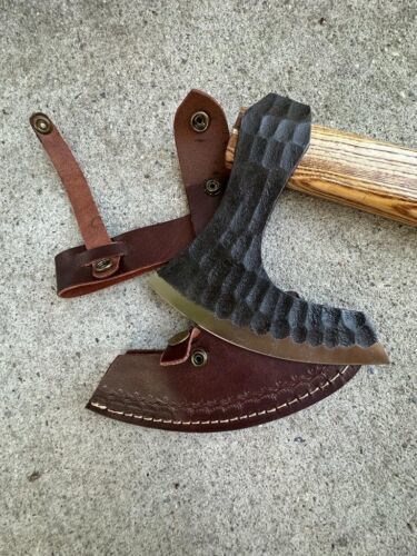 The handle is made from beautiful rosewood, carefully shaped for a secure and comfortable grip, while also enhancing the axe’s striking appearance. A protective leather sheath is included, ensuring safe storage and easy portability when not in use. This handcrafted Viking-inspired hatchet is both a functional outdoor tool and a collectible piece of art.