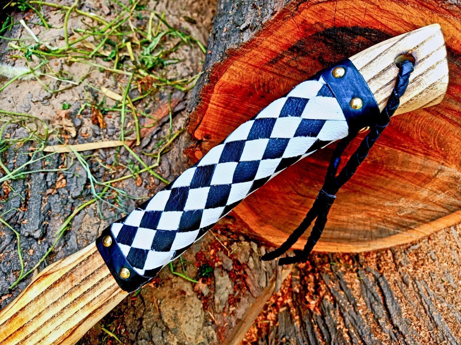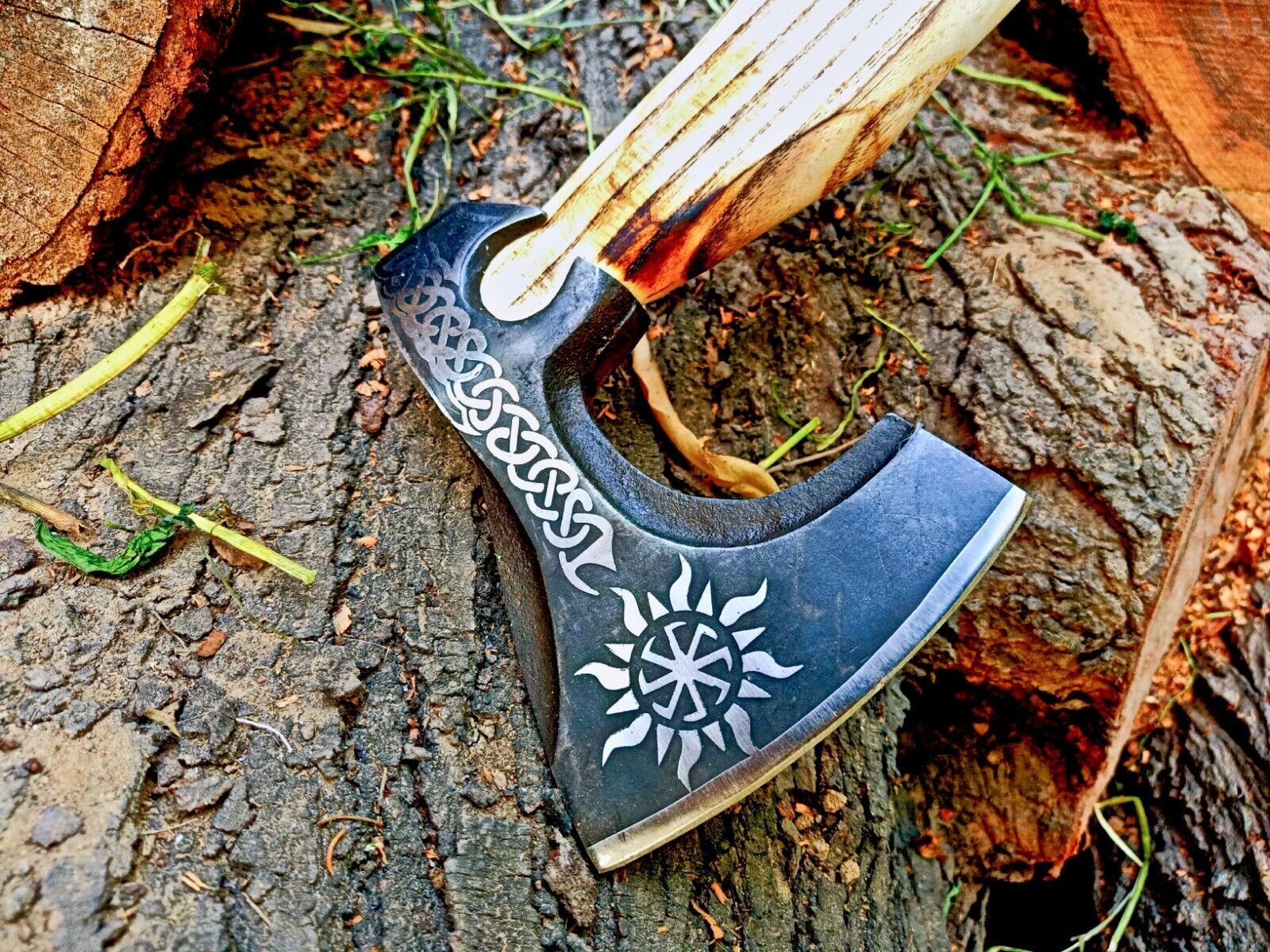 Experience the perfect combination of craftsmanship and functionality with this Handmade High Carbon Steel Vikings Hatchet. With an overall length of 18 inches, a 5.5-inch blade, and a 4-inch cutting edge, this axe is expertly forged from high carbon steel to maintain exceptional sharpness and durability. The blade is oil-tempered to 58-60 HRC and sharpened at 20 degrees, making it ideal for hunting, skinning, outdoor survival, and tactical use.The hand-crafted wooden handle is wrapped in leather for a secure grip, ensuring comfort and precision during use. The acid-etched blade adds a layer of corrosion resistance while enhancing its authentic Viking appearance. High carbon steel naturally reacts with moisture and acidic substances, so proper care is essential: clean with soap and water, dry thoroughly, coat in oil, and store away from the sheath for long-term protection.