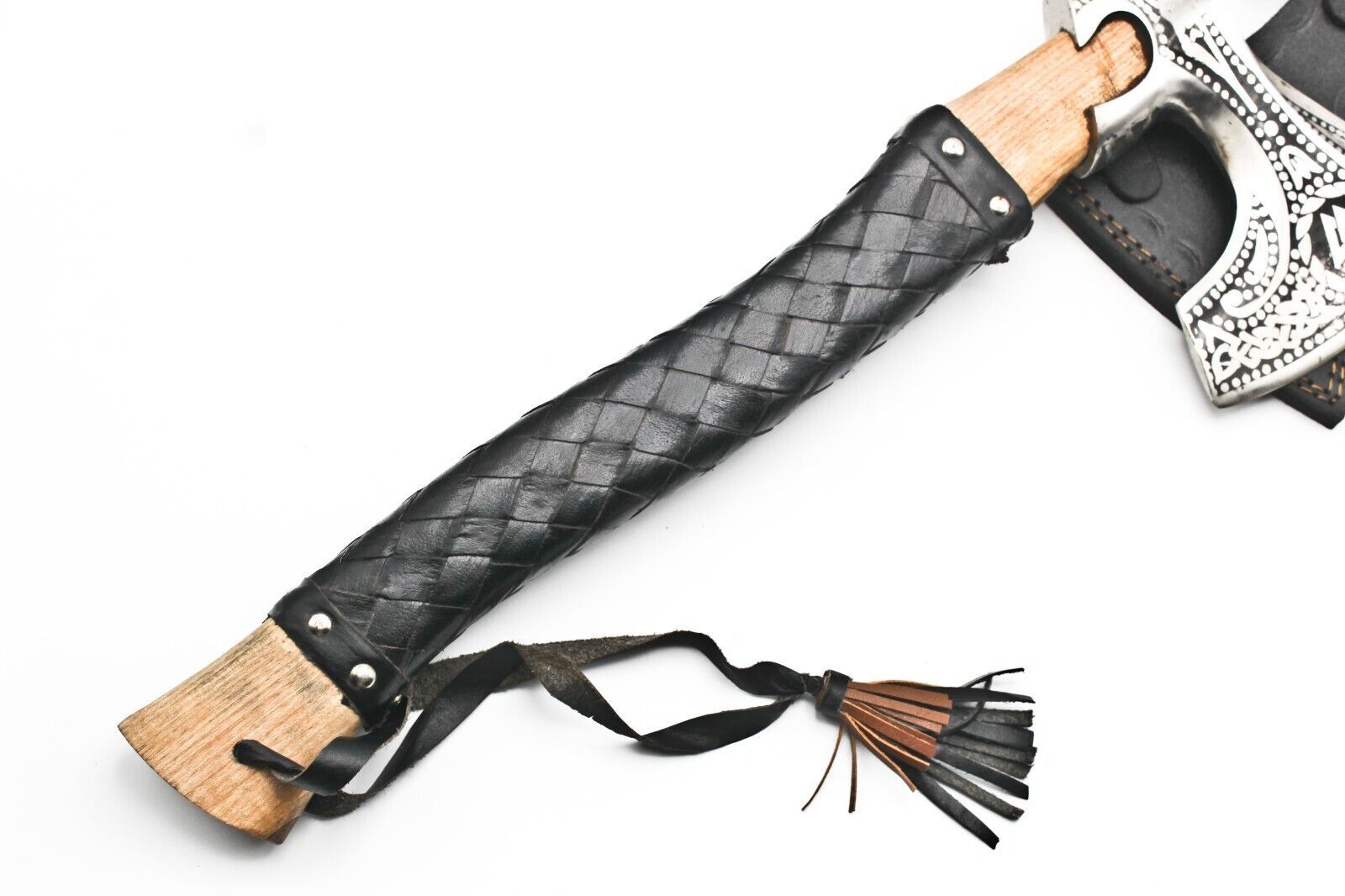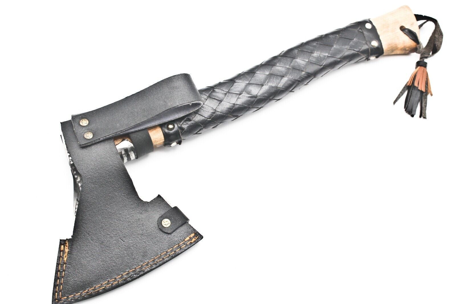 The hand-crafted wooden handle with a secure leather wrap provides a comfortable grip and ensures safe handling, while the acid-etched blade finish protects against corrosion and enhances the axe’s visual appeal. High carbon steel naturally reacts to moisture and acidic substances, so proper care is essential: clean with soap and water, dry thoroughly, coat the blade in oil, and avoid prolonged storage in the sheath.