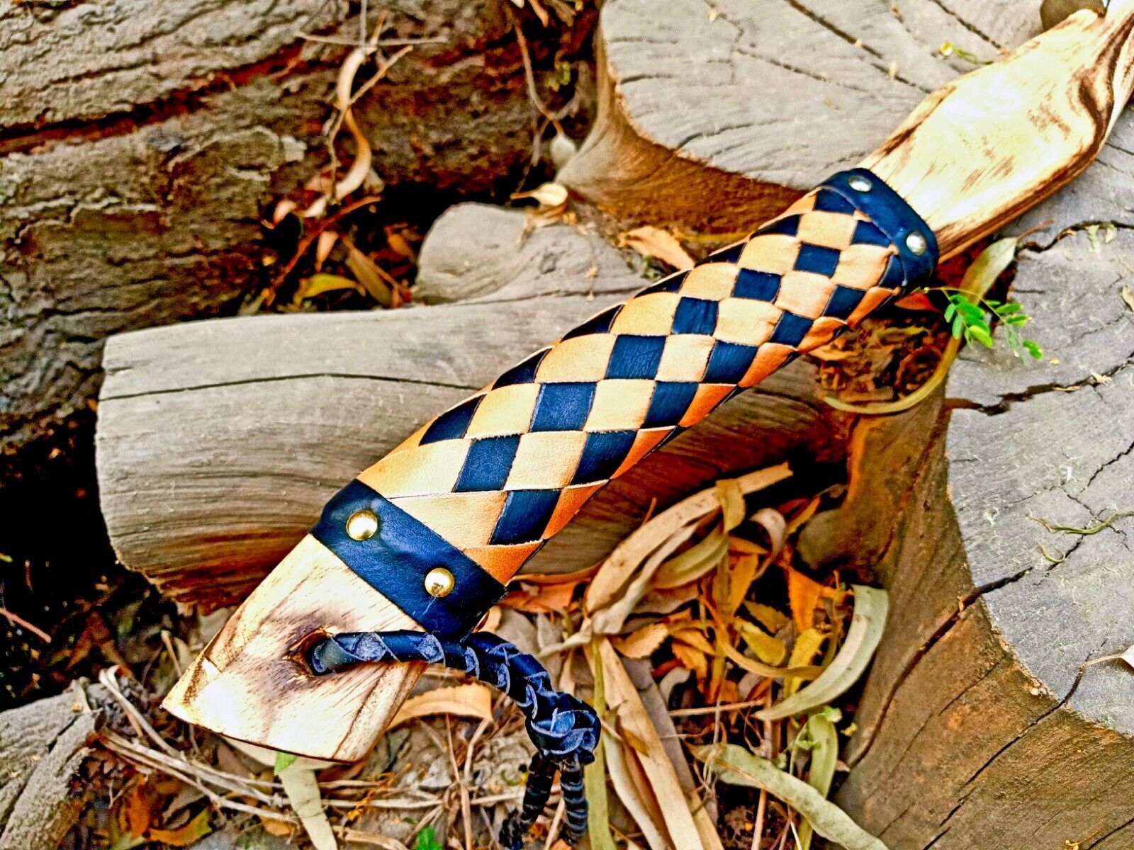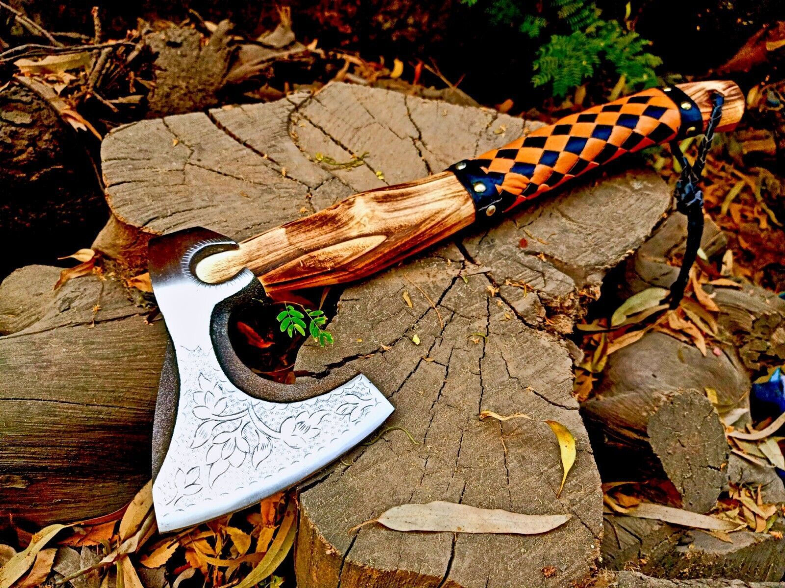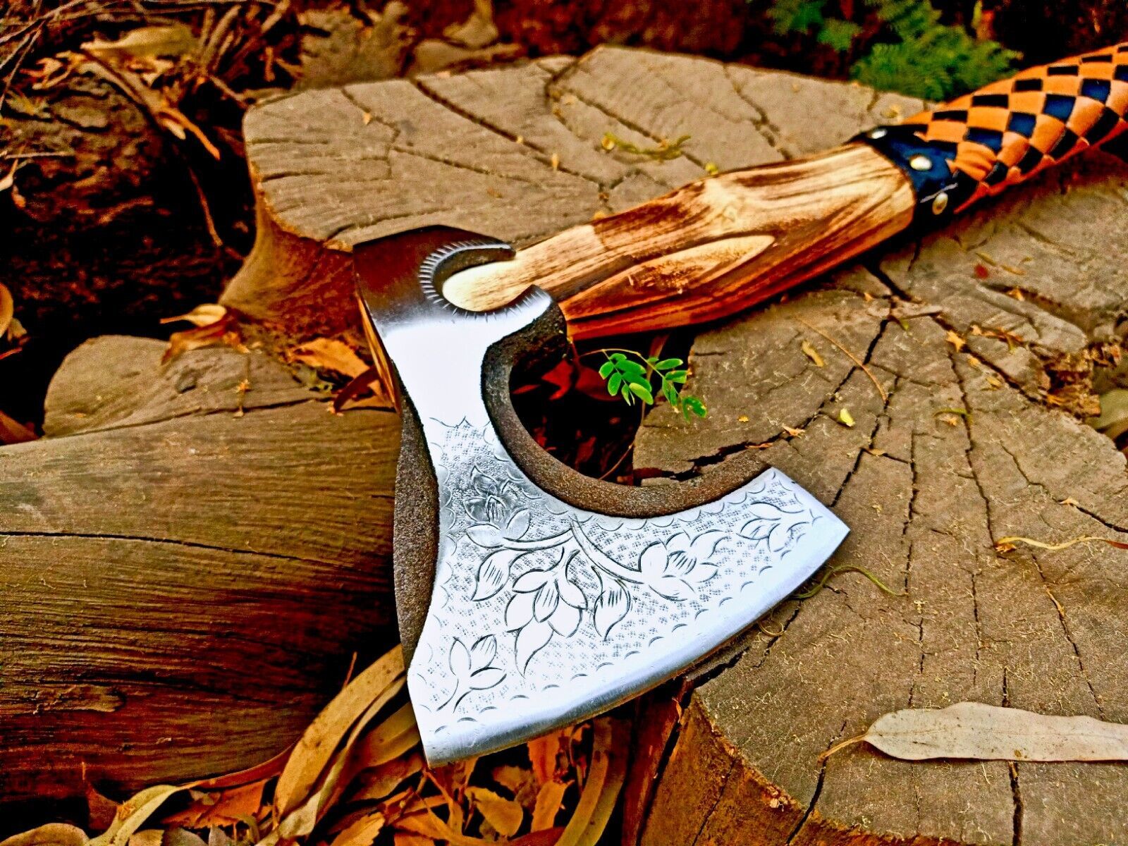 The axe is ideal for hunting, skinning, camping, or tactical use, but also makes a stunning decorative piece for display. The handmade wooden handle with leather wrap provides a comfortable and secure grip while protecting the blade in storage. Because high carbon steel is naturally reactive, it can tarnish when exposed to acidic liquids or prolonged moisture, so proper care is recommended: clean with soap and water, dry thoroughly, coat with oil, and store away from the sheath when not in use.