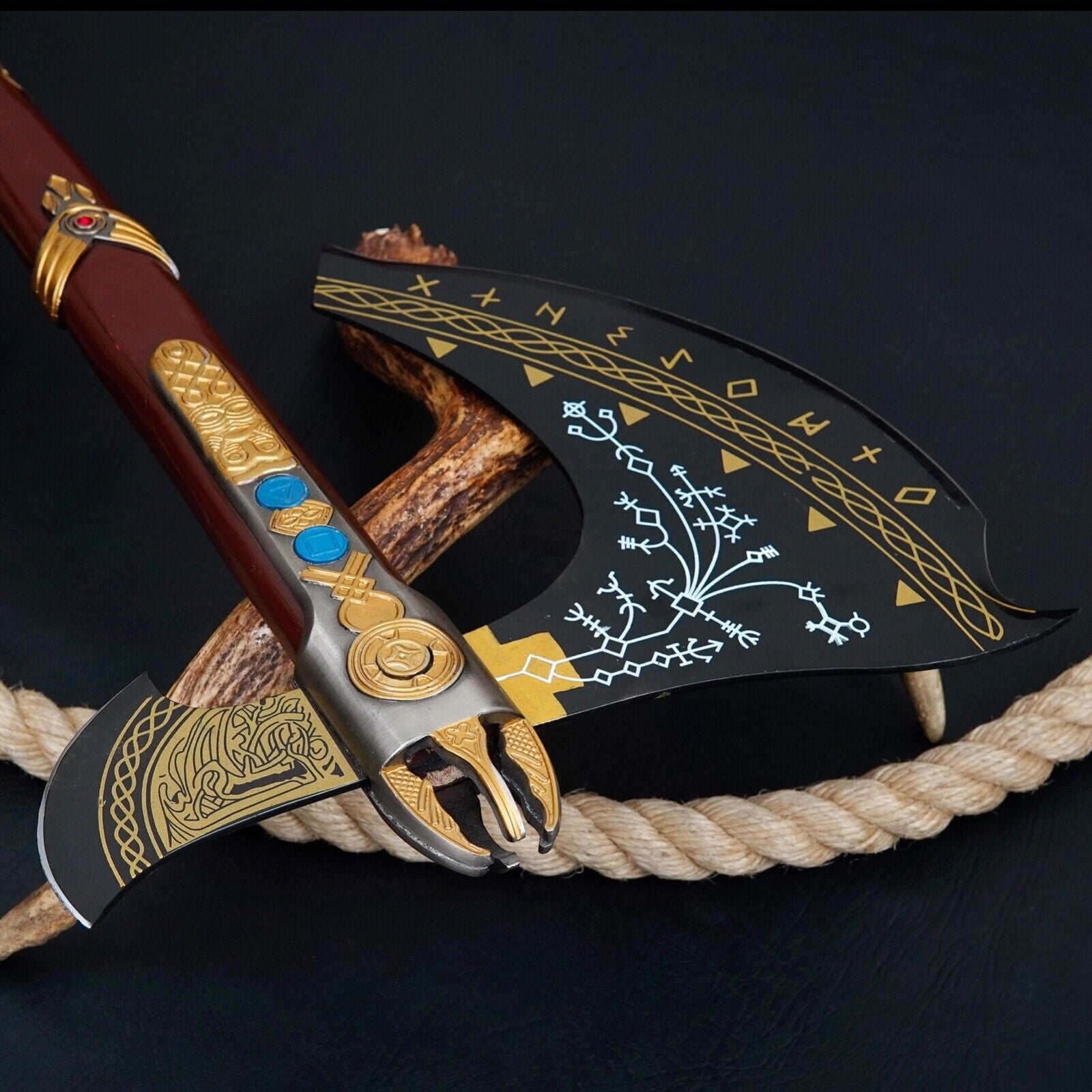 This handmade Kratos axe, inspired by the legendary Leviathan Axe from God of War, is a striking blend of craftsmanship, strength, and fantasy artistry. Forged from high-quality carbon steel, this massive viking battle axe measures an impressive 40 inches in overall length, with a 12.21-inch head and a 9.60-inch razor-sharp cutting edge. Built for both display and functional use, this fantasy viking axe pays homage to Norse mythology and the weapon wielded by Kratos himself.