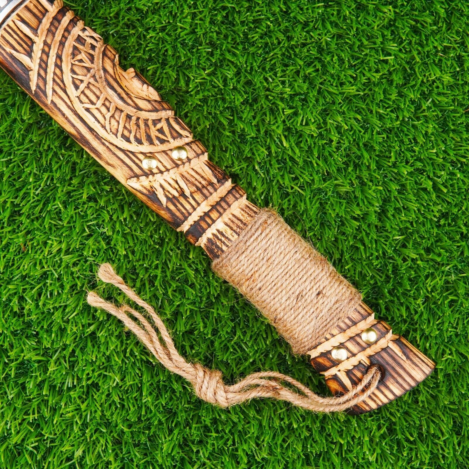 The ergonomic wooden handle ensures a secure, comfortable grip, allowing precise control during extended use. Each axe is fully handmade with no pre-bought parts, reflecting authentic Viking craftsmanship and attention to detail. Its compact design makes it easy to carry while maintaining the strength and reliability required for outdoor adventures.