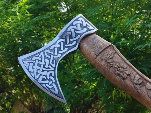This Viking throwing axe is a unique, handmade high carbon steel weapon, combining durability, functionality, and traditional Nordic artistry. Measuring 19 inches in overall length with a 6.5-inch cutting edge, it delivers exceptional sharpness and precision. The blade features intricate etching, creating a visually striking representation of Viking craftsmanship. The carved Ashwood handle, wrapped in colored leather, ensures a secure and comfortable grip while enhancing the axe’s aesthetic appeal. Each axe comes with a hand-sewn leather sheath for safe storage and transport. Ideal for collectors, reenactors, or enthusiasts of Viking battle axes, this axe is suitable for both decorative display and functional use. Its high carbon steel construction ensures long-lasting durability, while the detailed blade and handle design reflect the artistry and spirit of Viking warriors. Proper care, including cleaning and occasional oiling, maintains the blade’s sharpness and beauty. Whether displayed as a centerpiece or used for practice, this hand-forged axe is a remarkable fusion of ancient tradition and modern craftsmanship, making it a prized addition to any collection.