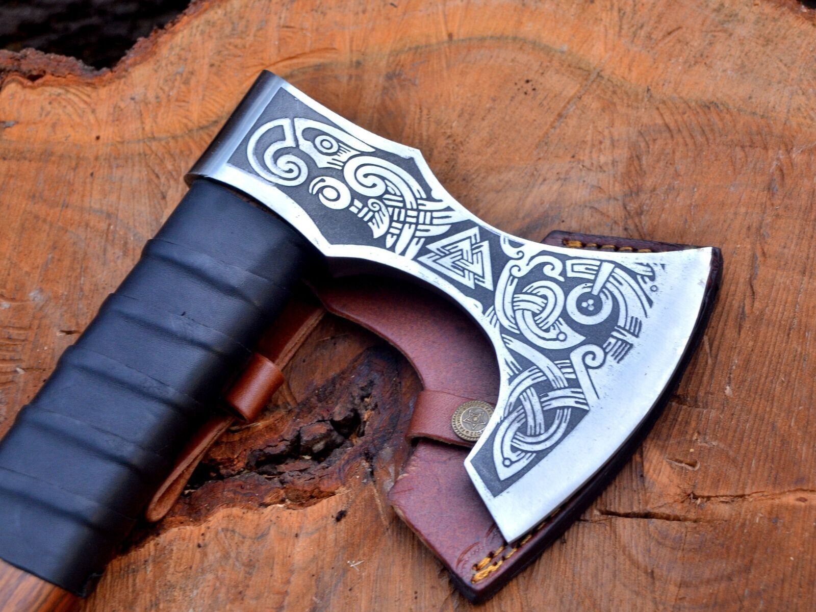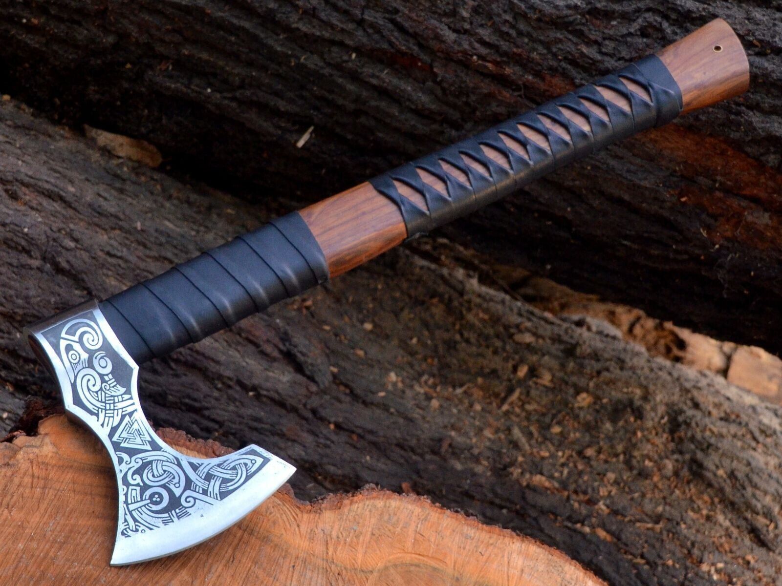 This custom handmade viking fighting axe is a striking blend of artistry and functionality, forged from high carbon steel for strength and durability. Designed as a traditional bearded war axe viking, it features a sharp hand-forged edge and a beautifully carved head with engraved details that showcase authentic craftsmanship. Measuring approximately 20 inches in overall length, this axe provides the perfect balance for camping, woodworking, and bushcraft tasks while retaining the iconic look of a historical viking dane axe. The solid wood handle is treated with oil and hard wax to emphasize its natural beauty and provide extra strength, making it comfortable and reliable for extended use. This versatile two handed viking axe embodies the rugged heritage of vikings battle axe designs, while also appealing to modern enthusiasts who appreciate the styling of steel axe osrs, steel city axes, and the steel woods axe. A custom leather sheath is included, fitted precisely to the cutting edge for safe storage and transport. Whether used outdoors or displayed as a collector’s centerpiece, this replica viking axe pays tribute to Norse tradition and the legendary imagery of the viking crossed axes, celebrating the power and artistry of the viking war axes.