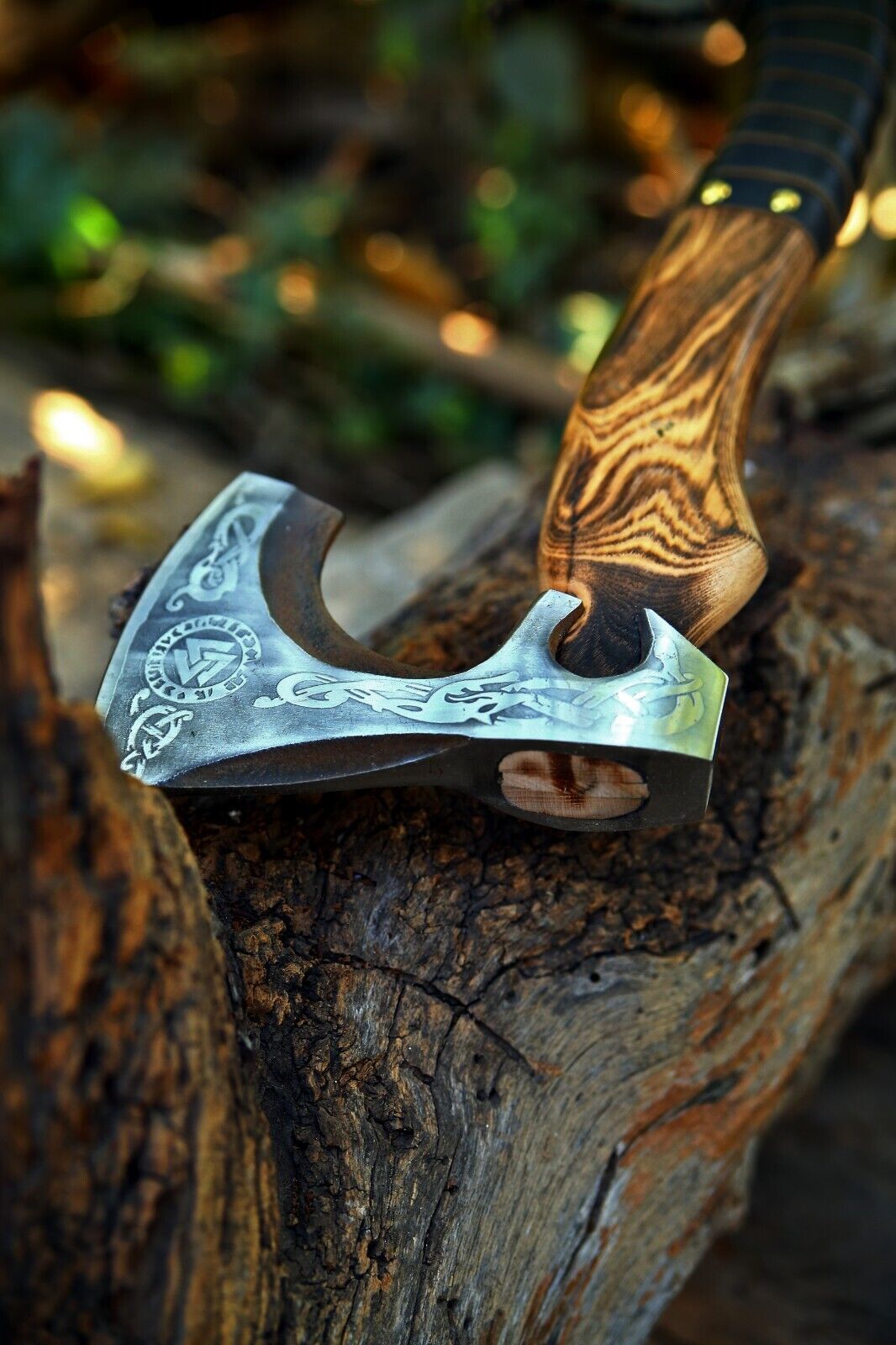 This handmade viking fighting axe is a finely crafted tool and collectible, forged from high carbon steel for durability and authentic appeal. Designed as a versatile tomahawk-style war axe viking, it features a strong integral build with a sharp cutting edge and balanced weight for effective performance. Measuring approximately 6 inches in axe width with a 4.5-inch cutting edge, this piece delivers precision and control whether used outdoors or displayed as part of a collection. The leather-wrapped shaft ensures a secure and comfortable grip, making it easy to wield this two handed viking axe for ambidextrous use. Its design pays homage to the historic viking dane axe and reflects the enduring legacy of vikings battle axe craftsmanship. This piece not only embodies the rugged tradition of steel axe osrs, steel city axes, and the steel woods axe but also brings the artistry of the viking crossed axes motif into modern hands. Each replica viking axe comes with a free custom leather case, offering protection and convenience for storage and transport. Whether given as a gift or added to your own collection, this viking war axes design is a timeless representation of strength, heritage, and artistry.