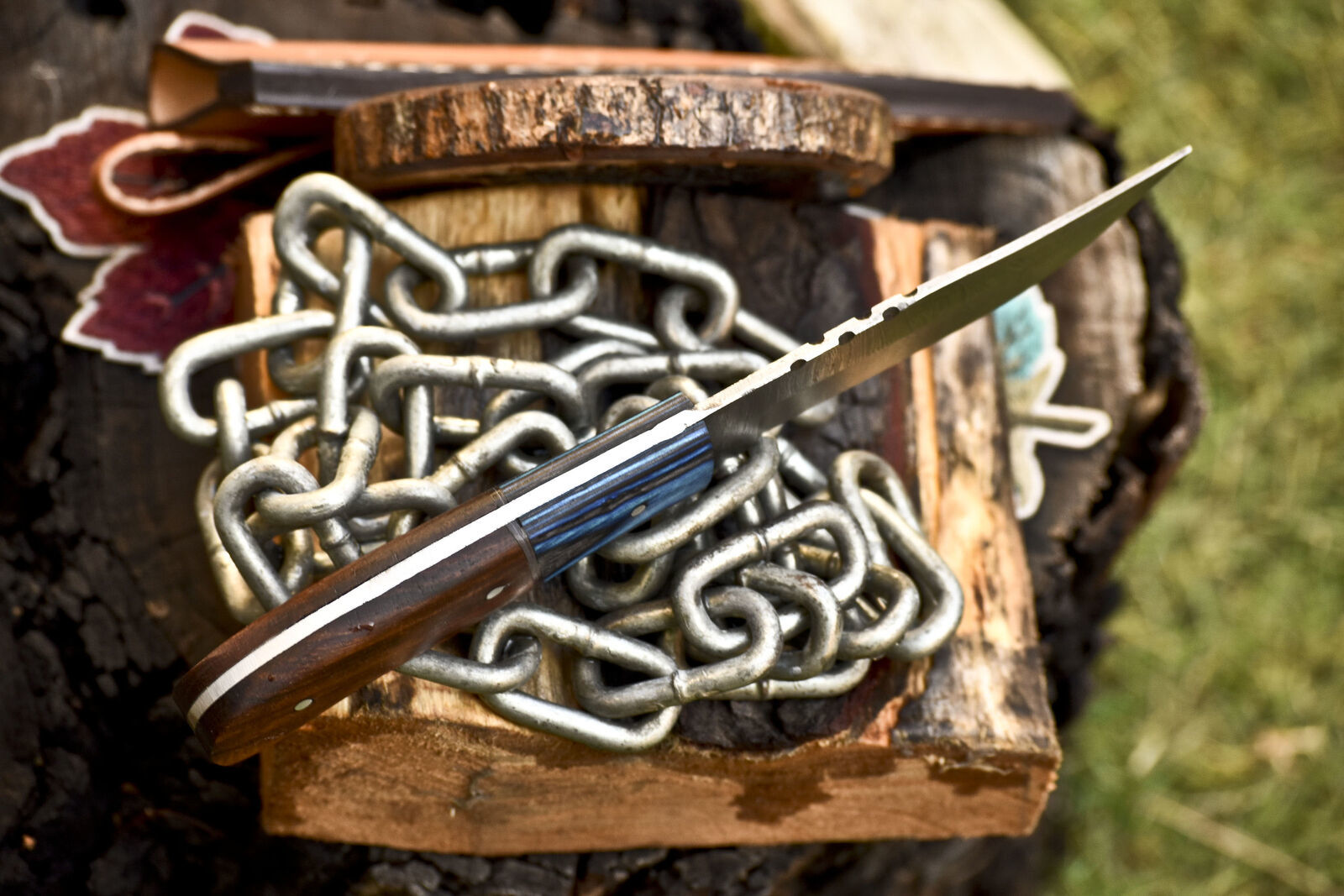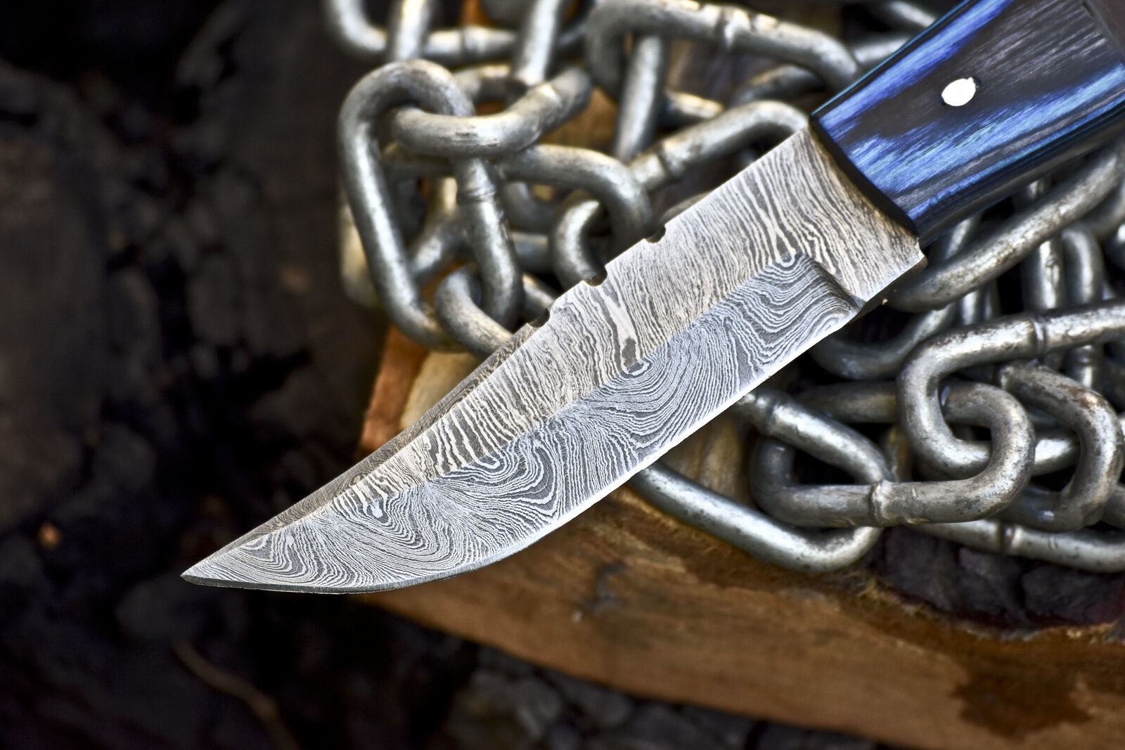 This damascus skinner knife features an overall length of 8 inches with a 4-inch blade and a 4-inch walnut wood handle paired with a sturdy wooden bolster for balanced grip and control. The blade is hand forged from a layered blend of 1095 and 15N20 steels, oil tempered to 58-60 HRC for optimal hardness and durability. The acid-etched Damascus steel showcases a bold twist pattern, with swirling lines that create a vivid sense of motion and depth, blending deep blacks and bright silvers into a striking, polished finish. Designed for professional skinners and outdoor enthusiasts, this knife excels in fishing, hunting, and skinning tasks with its wide, rigid blade edge that resists flexing. It comes with a thick, hand-tooled leather sheath that is robust enough to endure rough use and protects the blade safely. Each knife is 100% handmade with no CNC machining or blanks, making every piece unique with its own handcrafted charm. This knife combines functionality, durability, and a timeless aesthetic, making it a perfect gift or collectible.