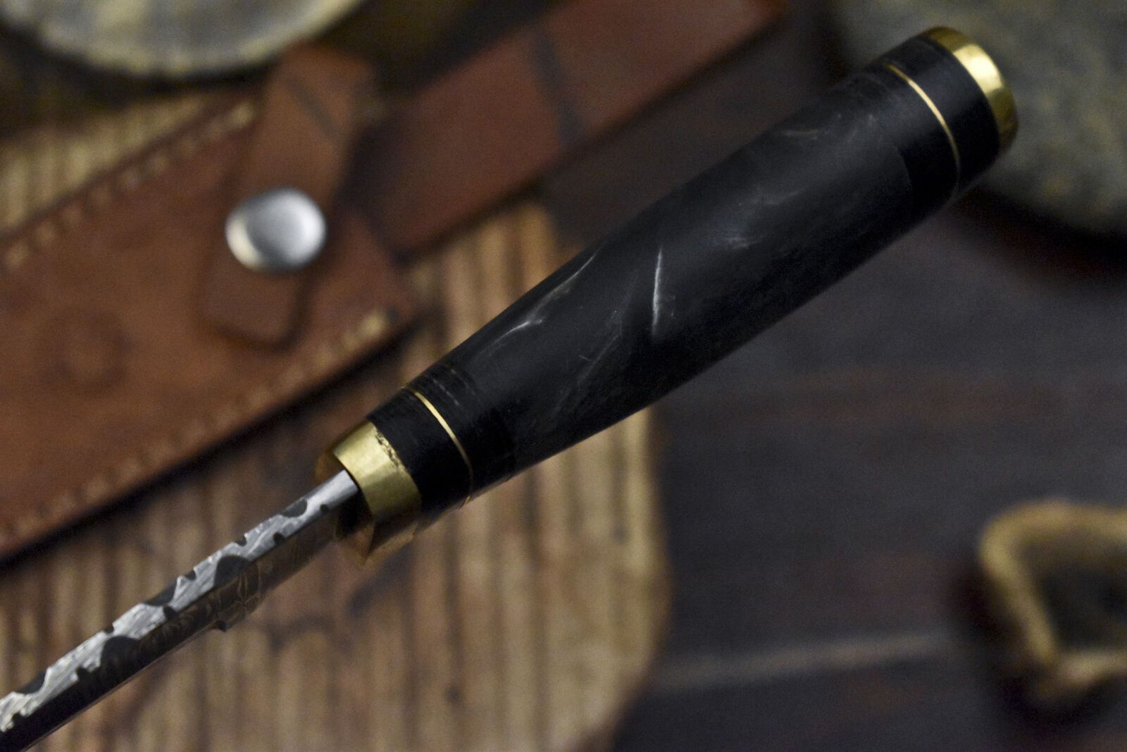 The handle is made from Corian, a tough, resilient material that provides excellent grip and durability, complemented by a brass guard for added strength and safety. The blade is oil tempered to 58-60 HRC for optimal hardness and edge retention.