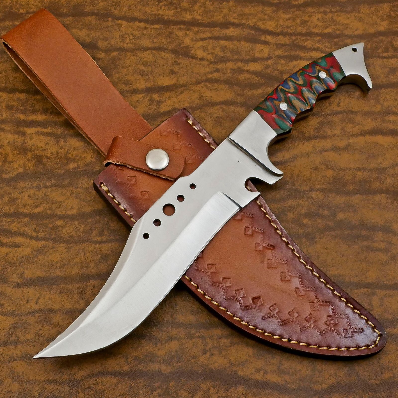 Discover the power, strength, and craftsmanship of our handmade stainless steel Bowie knife, built for hunters, campers, survivalists, and collectors alike. This 12-inch large Bowie knife is forged with premium stainless steel and a full tang construction, offering exceptional durability and balance. The sharp edge ensures precise cutting, while the heavy-duty build makes it reliable for all outdoor tasks, whether you are skinning game, chopping wood, or preparing camp essentials. The ergonomic handle design provides a secure and comfortable grip, complemented by a steel guard for safety during heavy use. This tactical stainless steel Bowie knife is more than just a tool—it is an outdoor companion designed to withstand rugged conditions while retaining its edge for long-term performance. Its striking design makes it an excellent collector’s piece, while its affordability and practicality make it accessible for everyday outdoor enthusiasts. Whether you are searching for a stainless steel Bowie knife with sheath for hunting, camping, combat, or survival, this handcrafted blade is the perfect choice. Ideal as a functional hunting tool, a gift item for knife lovers, or as part of your outdoor gear collection, this stainless steel Bowie knife blends traditional craftsmanship with modern durability.