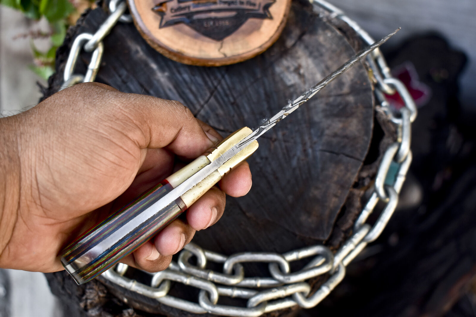 This Handmade Twist Damascus Skinner Knife blends rugged performance with refined craftsmanship, making it an essential tool for hunters, hikers, and outdoor enthusiasts. Forged from a combination of 1095 and 15N20 high-carbon steel, the blade boasts 512 layers of meticulously folded Damascus, acid-etched to reveal a bold twist pattern. The swirling lines create a sense of motion and energy, with contrasting deep blacks and bright silvers for a striking, timeless finish. Measuring 8 inches overall, the knife features a 4-inch blade, oil-tempered to 58–60 HRC for exceptional edge retention and durability. The handle is crafted from polished bone and rich wood, secured with a solid brass guard for safety and balance. This skinner knife’s wide, rigid blade is perfect for skinning, dressing game, or handling precision cutting tasks in the field. Included is a top-quality, hand-tooled leather sheath, double-stitched for long-lasting strength, allowing safe and convenient carry. Fully handmade in Pakistan without CNC or pre-cut blanks, each knife is one-of-a-kind. Whether used in the wilderness or displayed in a collection, this custom Damascus fixed blade hunting knife offers beauty, reliability, and authentic craftsmanship.