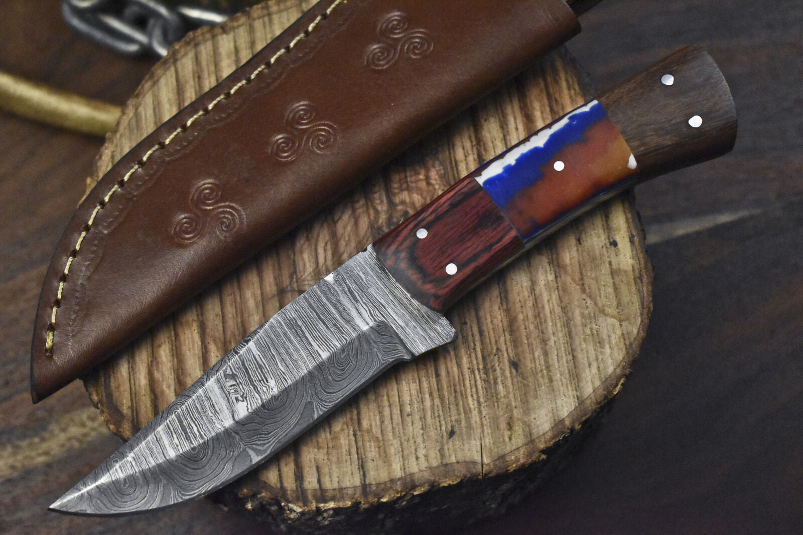 The contoured Corian handle, combined with a polished wooden bolster, ensures a secure and comfortable grip, making it ideal for skinning tasks in the wild or precision cutting in everyday situations. As a standout damascus skinner hunting knife, it comes complete with a hand-tooled leather sheath for safe carry and storage. Whether you're searching for a damascus acid etched fixed skinner knife or a collectible piece, this knife offers unmatched reliability and style. This is not just a tool—it's a functional work of art, crafted for those who demand excellence in their damascus skinner knife for sale.