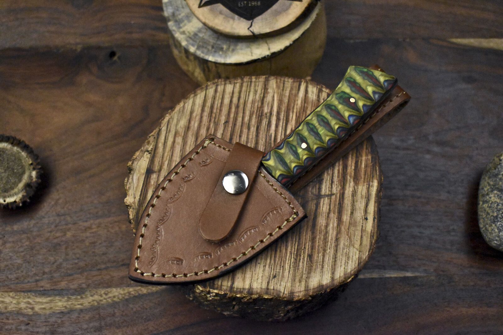 This handcrafted damascus skinner knife is expertly designed for precision skinning and hunting tasks. The 3.5-inch blade features a unique twist pattern forged from layered 1095 and 15N20 Damascus steel, acid-etched to reveal captivating swirling contrasts of deep black and bright silver. Tempered to 58-60 HRC, the blade offers a rigid, sharp edge that excels in durability and cutting performance. Equipped with a gut hook, it enables safe and controlled field dressing of game such as deer and elk. The handle is crafted from premium hard wood, delivering a comfortable and secure grip while showcasing natural beauty that complements the blade’s dynamic pattern. This damascus acid etched fixed skinner knife also includes a top-quality, hand-tooled thick leather sheath for lasting protection. Every knife is 100% handmade without the use of CNC machines or precut blanks, ensuring each piece is a unique work of art. Perfect for hunters, outdoorsmen, and collectors, this handmade skinner damascus knife combines traditional craftsmanship with modern functionality to provide a reliable and elegant tool.