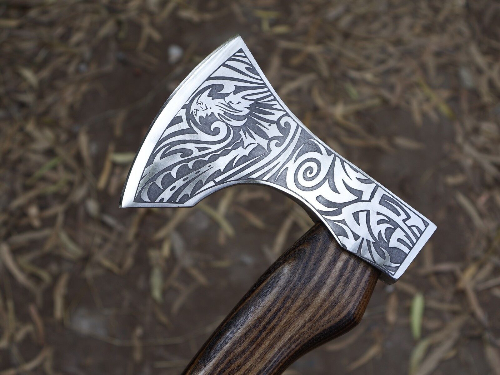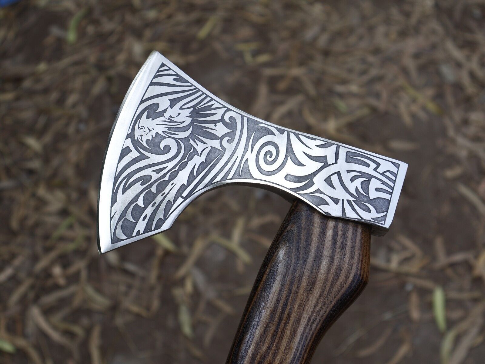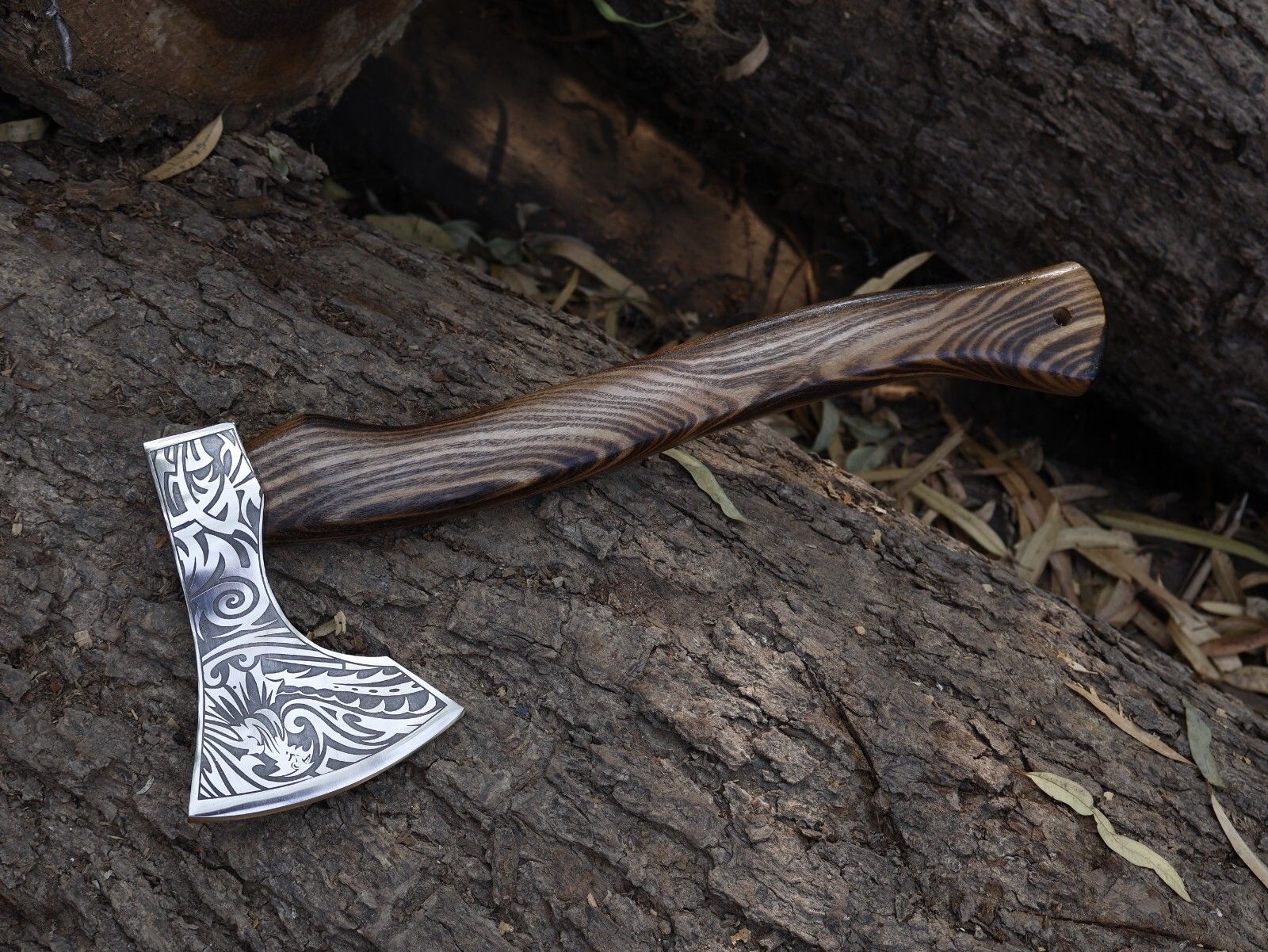 This hand forged Viking axe is a perfect blend of durability, craftsmanship, and traditional Nordic style. Featuring a strong carbon steel blade and a beautifully crafted ash wood handle, it is designed for both functionality and aesthetics. With an overall length of approximately 18 inches, this axe has a 6.5-inch wide head and a sharp 4.5-inch cutting edge, making it suitable for chopping, camping, hunting, or display.The blade is meticulously hand forged from over 270 layers of 1095 and 15N20 high carbon tool steels, strengthened with a nickel layer for resilience and striking character. Heat treated to a Rockwell hardness of 56–57 HRC, this axe delivers excellent edge retention and long-lasting performance in demanding outdoor use.