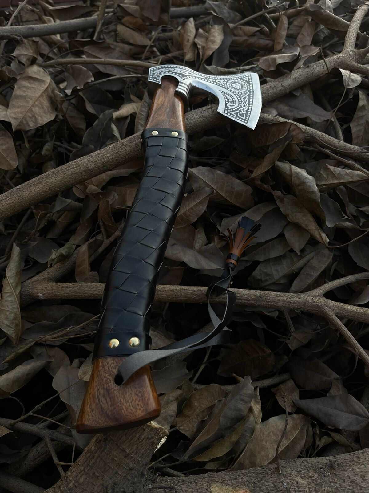 The handle is made from premium rosewood, wrapped in high-quality leather for a secure and comfortable grip that enhances both function and aesthetics. Weighing approximately 1.23 kg, this axe offers a solid yet manageable feel, making it ideal for practical use as well as display. Each axe also includes a custom leather sheath and a leather wrap cover, ensuring both protection and an authentic presentation.