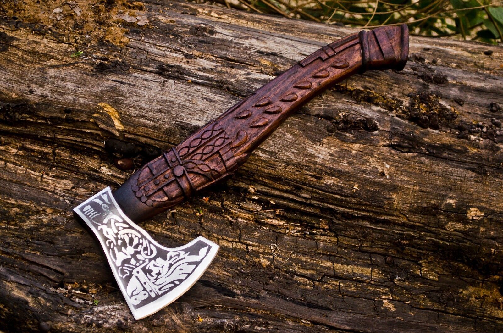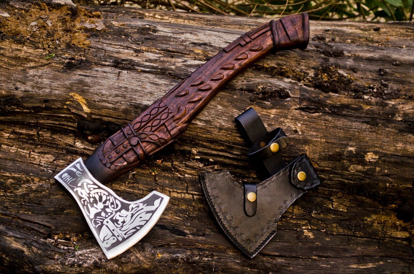 This exquisite handmade Viking axe is crafted from premium high-carbon steel, featuring a razor-sharp blade with a hardness of 58-60 HRC. The axe measures approximately 20 inches in overall length, with a 5-inch cutting edge and a 6-inch axe head, making it both functional and visually striking. The handle is made from solid natural wood with a unique helmet engraving design, providing a secure and comfortable grip. Each axe comes with a high-quality hand-tooled leather sheath, reinforced with extra stitching to ensure durability and protection during transport. Meticulously hand-forged by skilled artisans, this Viking axe is perfect for camping, bushcraft, woodworking, or as a stunning collectible piece. Custom engraving on the handle or blade is available, making it an ideal personalized gift for birthdays, anniversaries, or special occasions.