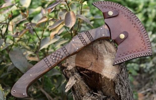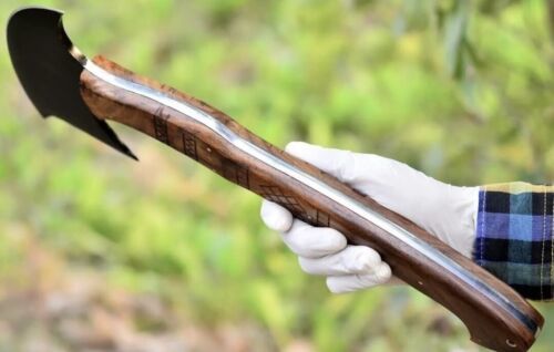 This Viking Eagle Art hatchet is a handmade carbon steel weapon, expertly crafted for collectors, campers, and enthusiasts of authentic Norse craftsmanship. Measuring approximately 16 inches in overall length, the blade is constructed from high-quality carbon steel, while the full tang design ensures durability and balance. The wooden handle provides a secure, comfortable grip, and the ambidextrous design allows both right and left-handed use. The axe features intricate hand-forged detailing, giving it a unique, vintage aesthetic that reflects the artistry and spirit of Viking weaponry. Ideal for camping, throwing, or display, this replica Viking axe combines functionality with striking design, making it a standout piece for any collection. Its brown-toned handle and hand-forged blade provide an authentic look, ensuring it appeals to collectors of Viking battle axes, knives, and other edged weapons. Proper care, including cleaning and oiling, preserves the blade’s sharpness and enhances the longevity of this beautifully crafted hatchet. This handmade Viking eagle axe embodies both artistic design and practical performance, making it a prized addition to any collection or outdoor gear set.