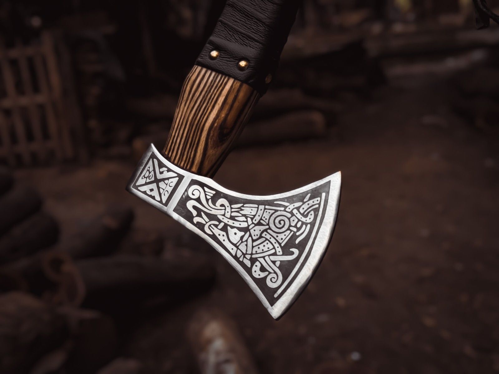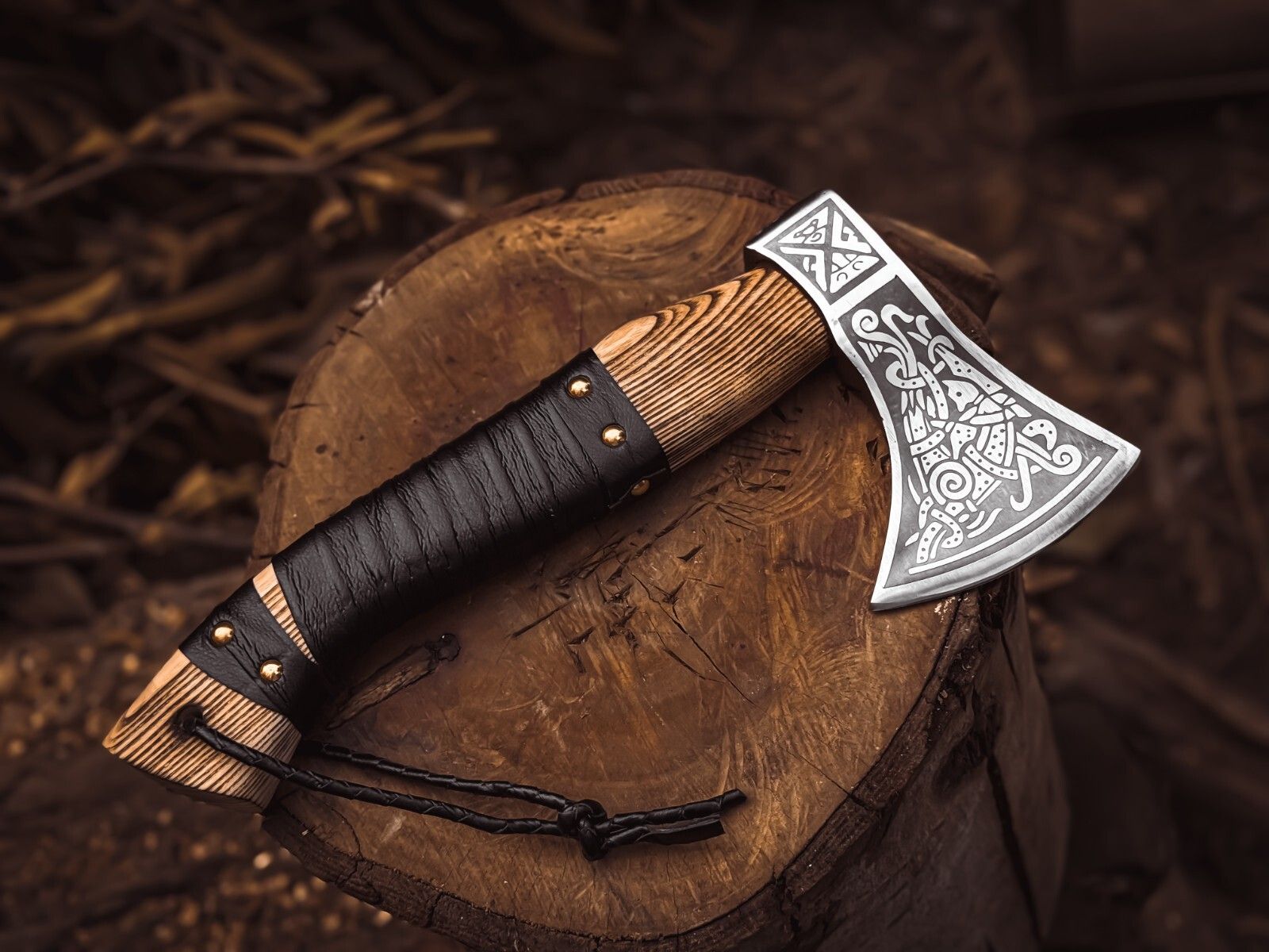 Handmade Viking Forged Carbon Steel Throwing Axe with Wood Handle and Cow Leather Sheath