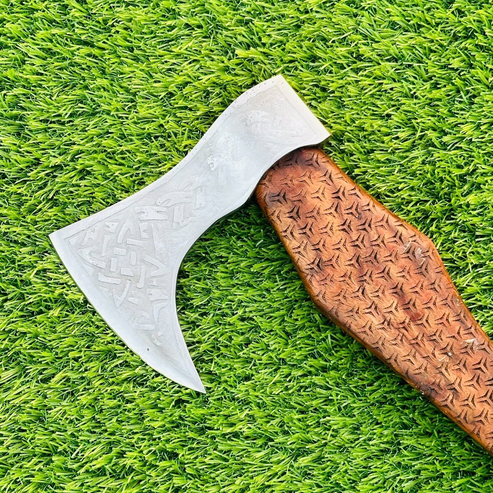 Experience the strength and artistry of authentic Viking craftsmanship with this custom handmade Viking tomahawk. Forged from high carbon steel and hardened to 54-58 HRC, this axe is built for durability, edge retention, and reliable performance. It features an overall length of approximately 17.5 inches, with a 5-inch cutting edge and a 6-inch head length, offering a balanced and practical design suitable for throwing, camping, or display. The handle is made from carefully selected natural wood, chosen for its strength, flexibility, and textured grip, ensuring comfort and control in use. Each axe is individually hand-engraved, making every piece unique and highlighting the skill of traditional hand-forging techniques. A protective sheath is included for safe storage and transport, allowing collectors, reenactors, or outdoor enthusiasts to enjoy the axe responsibly. Perfect as a gift or for historical displays, this Viking tomahawk combines functionality, aesthetic appeal, and historical inspiration. The detailed engraving and high-quality materials make it a standout piece in any collection, reflecting the legacy and spirit of Norse warriors. Whether for outdoor use, collection, or reenactment, this hand-forged axe is a powerful and artistic representation of medieval Viking weaponry.