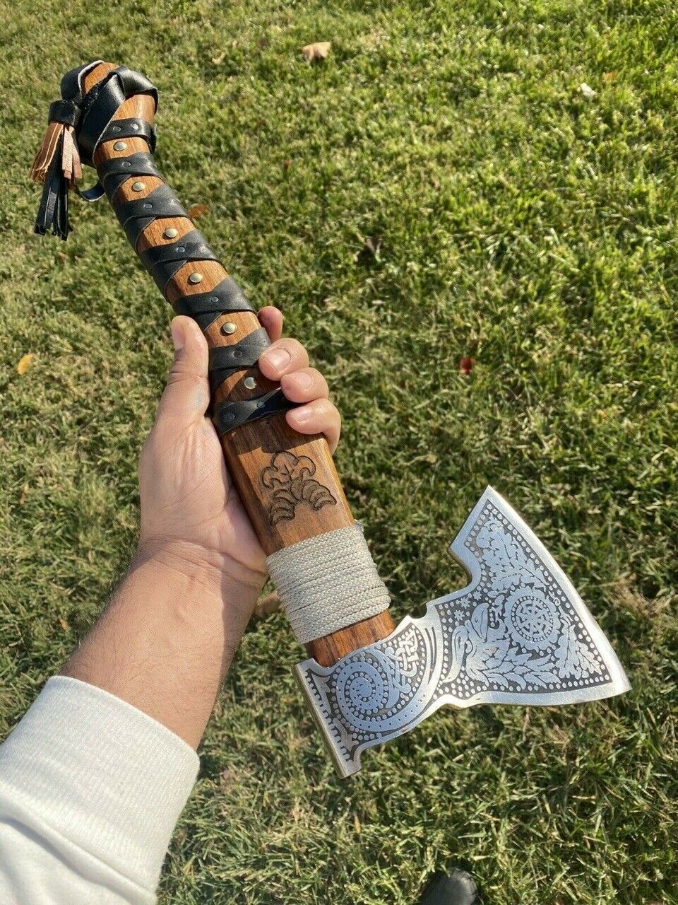 This handmade Viking tomahawk is forged from high carbon steel, crafted with durability and balance in mind. With an overall length of 18 inches, this compact yet powerful hatchet is ideal for outdoor adventures, wood chopping, throwing practice, or as a collectible display piece. The axe head measures 6.5 inches wide with a sharp 5-inch cutting blade, offering excellent performance whether used for camping tasks or as a traditional Viking-inspired tool.