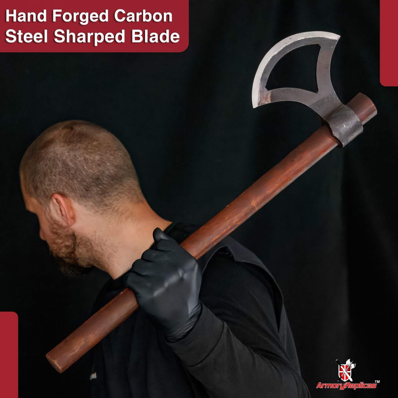 This Viking medieval battle axe is a striking blend of authentic design and modern craftsmanship, built for collectors, history lovers, and outdoor adventurers. Forged from durable high carbon steel, the axe features a distinctive center cutout that reduces weight while enhancing agility, much like a fuller on a sword. With a weathered blackened finish, it resembles a true replica viking axe, making it perfect as both a functional tool and display piece. The overall length measures approximately 24 inches, with a 6.25-inch cutting blade and a 6.5-inch axe head that delivers balance and power. The handle is handcrafted from rich Sheesham heartwood, stained in a warm natural tone to highlight the grain while providing durability and a comfortable grip. This custom viking axe comes with a premium leather sheath, ensuring safe storage and transport while preserving the sharp edge. Whether used as a viking battle axe for reenactments, a rugged camping companion, or a collectible gift, this piece captures the fearless spirit of the Norse warriors. Built for strength and longevity, this hand forged carbon steel axe is a true symbol of Viking heritage.