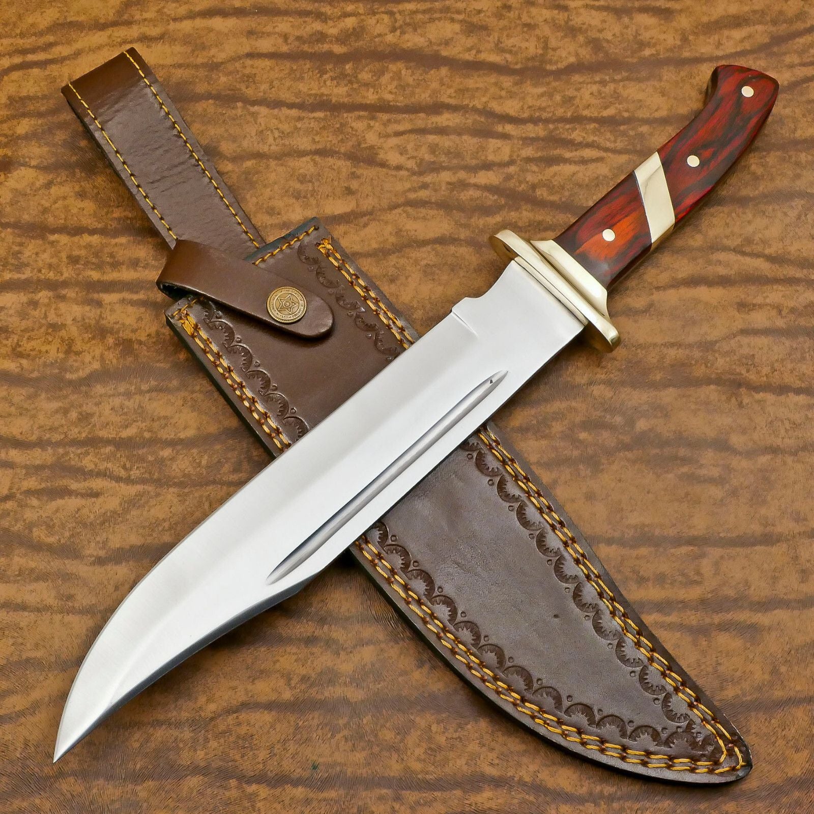 Conquer the outdoors with this heavy-duty 12-inch D2 steel full tang huge Bowie hunting and sport knife, designed for serious hunters, campers, survivalists, and collectors. This knife delivers exceptional strength, durability, and precision in every cut. The D2 tool steel blade is renowned for its superior hardness, outstanding edge retention, and excellent wear resistance, making it ideal for chopping, slicing, piercing, and skinning during hunting expeditions, camping trips, or survival scenarios. Its classic Bowie design ensures versatile performance in a variety of outdoor tasks, combining ruggedness with timeless style.The full tang construction provides unmatched stability, strength, and balance, allowing this knife to withstand demanding tasks with ease. The ergonomically crafted handle offers a secure, comfortable grip, reducing hand fatigue during prolonged use while giving you precise control for detailed and heavy-duty cutting. Each knife is carefully handmade by skilled artisans, giving it unique character and artisanal quality that sets it apart from mass-produced alternatives. A custom leather sheath is included for safe storage and convenient portability, making this Bowie knife ready for immediate outdoor use. Rugged, reliable, and beautifully designed, this 12-inch D2 steel full tang huge Bowie hunting and sport knife is a must-have tool for outdoor enthusiasts and collectors alike.
