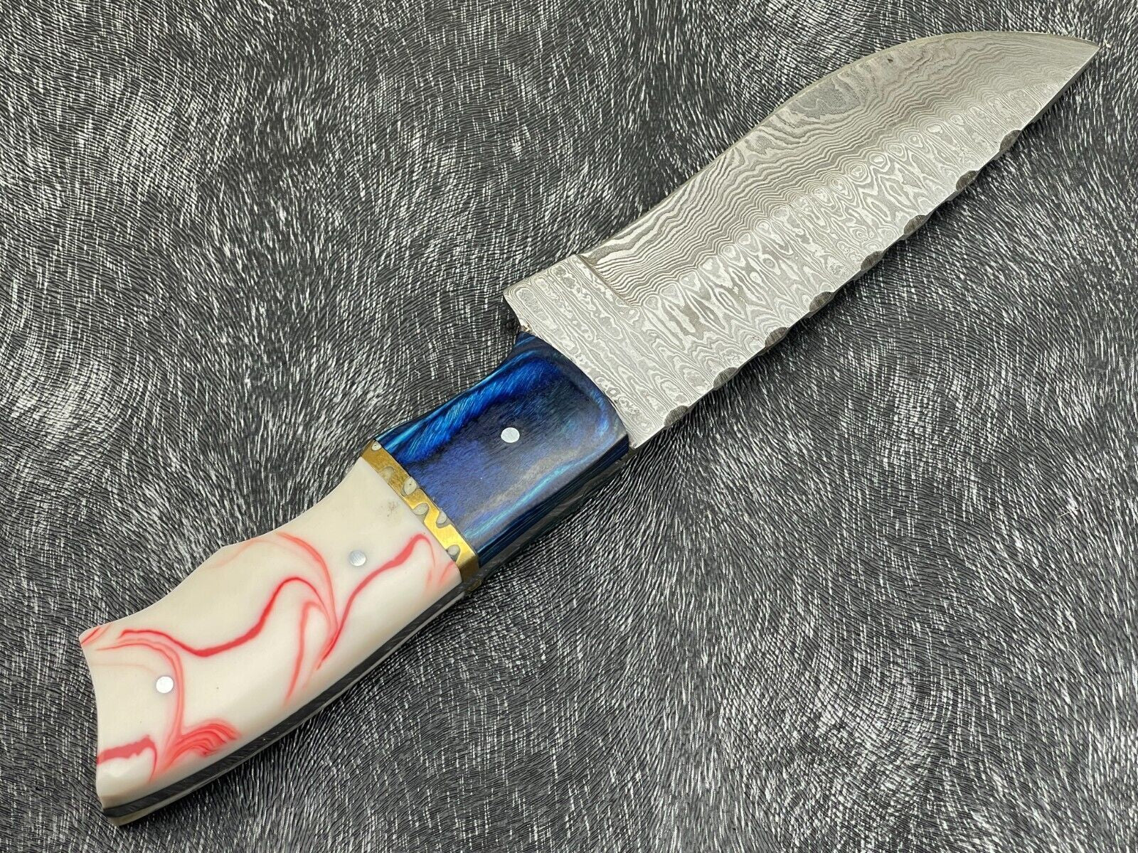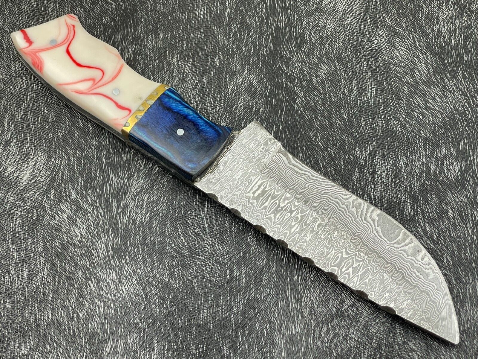 This exceptional knife boasts a beautiful custom handle made from resin and hardwood, secured with brass pins and a brass spacer. The handle design ensures a firm and comfortable grip while offering a striking appearance that blends elegance and strength. Its full tang construction provides superior durability and balance, making it a reliable tool for bushcraft, field dressing, or camp utility.