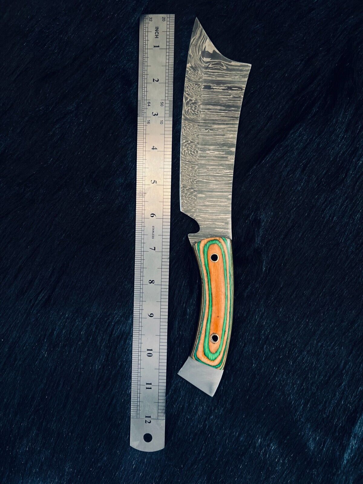 The Heritage Forge 11.5 Inch Fire Damascus Steel Machete Knife is a compact yet powerful tool, ideal for outdoor enthusiasts, hunters, and collectors alike. Expertly hand forged in Pakistan, this stunning knife features a 6.05-inch fire-pattern Damascus steel blade, crafted from 512 layers of 1095 and 15N20 high carbon steels. The fire twist design not only looks exceptional but delivers long-lasting edge retention due to its unique microscopic saw-like structure.