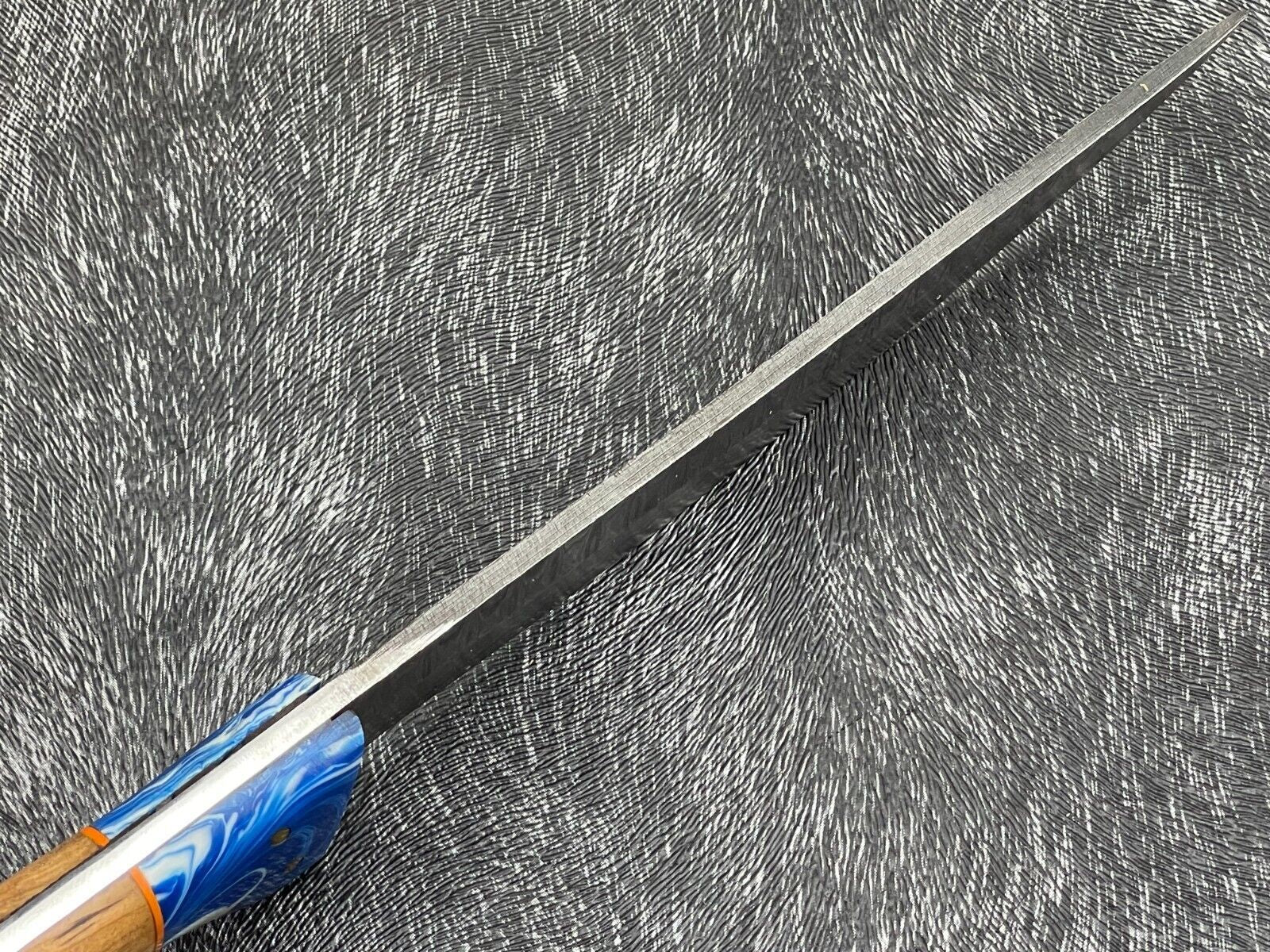This full tang blade is complemented by a beautiful handle crafted from olive hardwood and resin, fastened securely with brass pins for stability and aesthetic appeal. Ergonomically shaped for a comfortable grip, the handle ensures ease of use during skinning, cutting, or general outdoor tasks. Hand file work along the spine adds a decorative touch and enhances overall control.