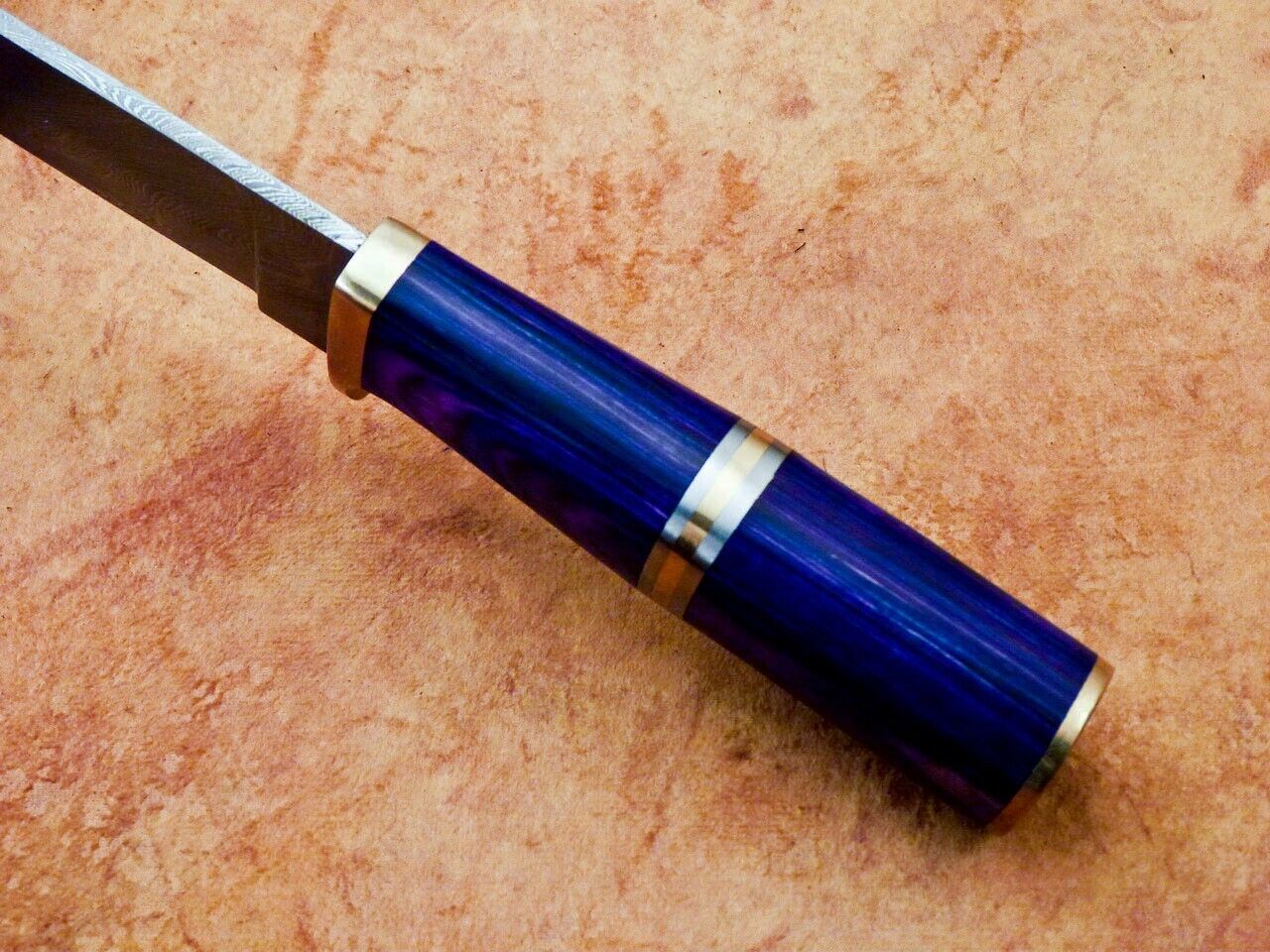 The 5-inch handle is crafted from premium hardwood, offering a secure and comfortable grip even during demanding tasks. A hand casted brass bolster adds elegance and balance, making this knife both functional and refined. The full tang construction ensures strength, while the Rockwell hardness of 50–54 along the edge provides exceptional performance in the field.