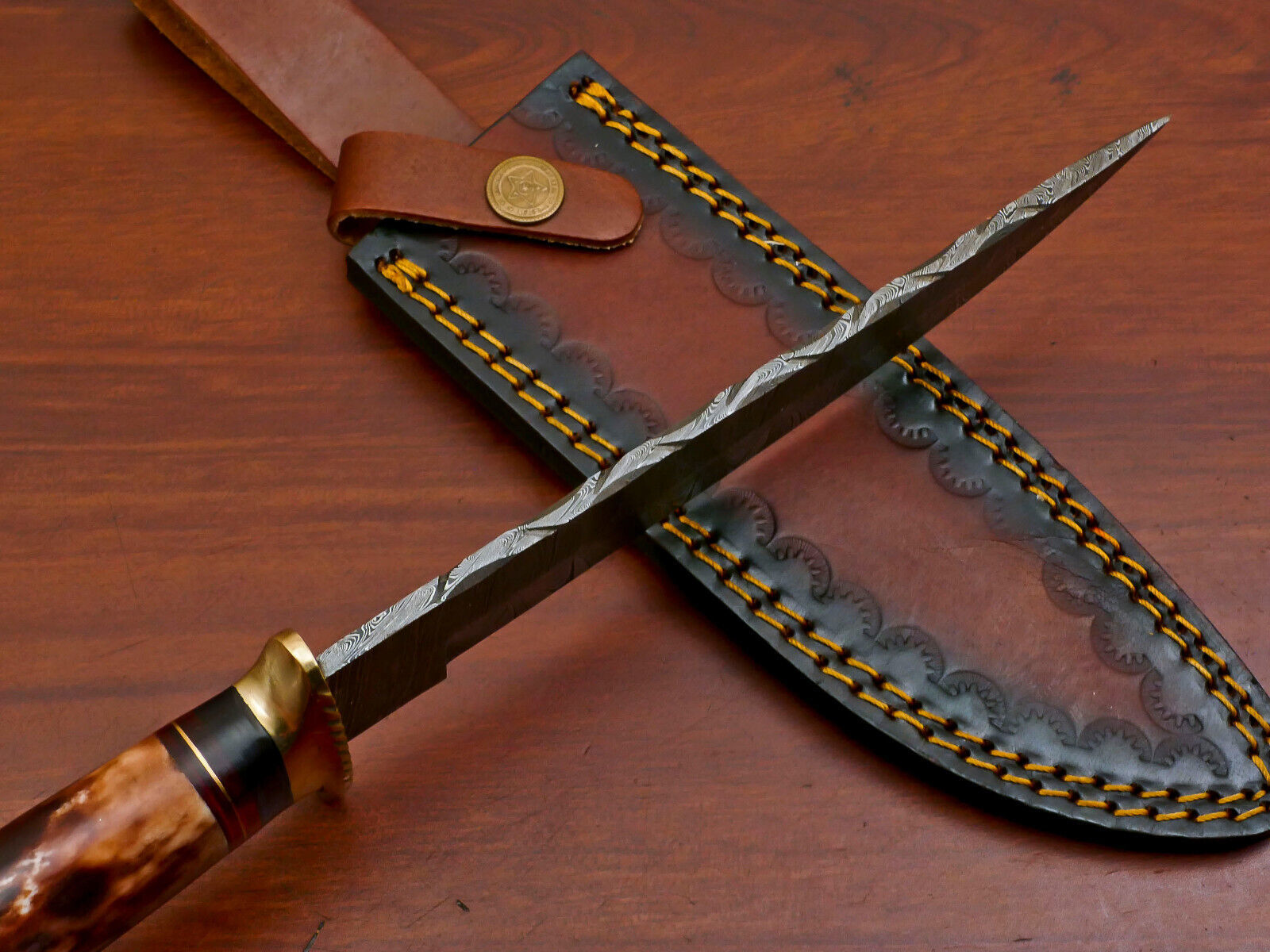 This custom Bowie knife comes with a top-quality handmade leather sheath, crafted from genuine calfskin to fit this knife perfectly. Made by skilled artisans in Pakistan, every blade is unique and reflects true Damascus craftsmanship—even in its D2 tool steel version.