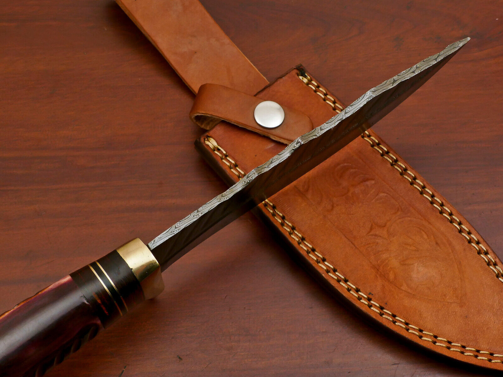 This knife comes with a custom-fit, genuine leather sheath made from premium calfskin, hand-tooled and sewn for a secure and snug fit. Whether you're outdoors or adding to your display, this knife is a timeless piece of artisan craftsmanship—handmade in Pakistan and built to impress.