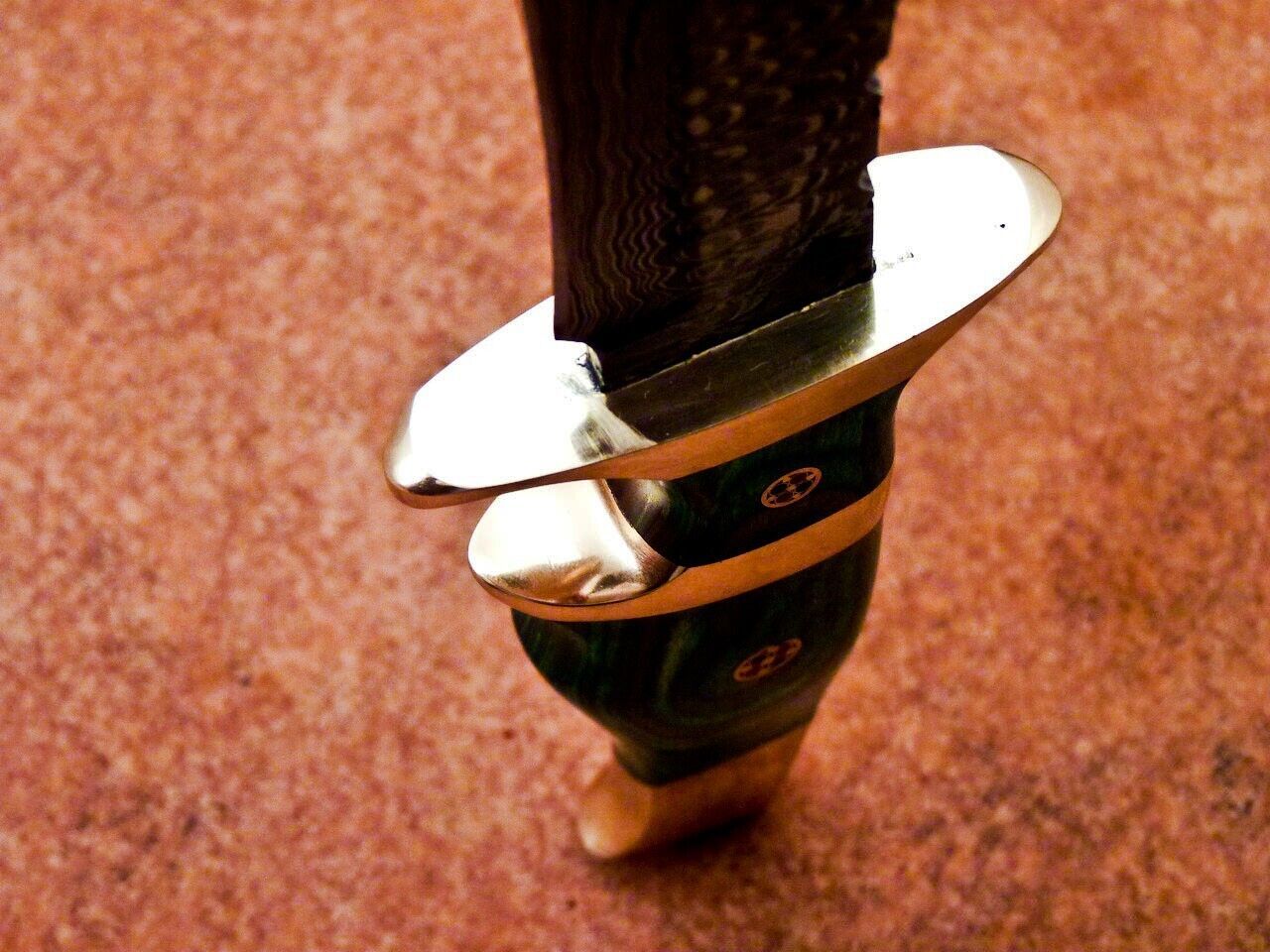 Crafted from 512 layers of 1095 and 15N20 high carbon steel, the blade boasts a razor-sharp edge and stunning pattern that reflects the dedication behind every hammer strike. The 4 mm thick Damascus steel blade is heat treated to a Rockwell hardness of 54 at the edge, ensuring lasting performance even under tough field conditions.