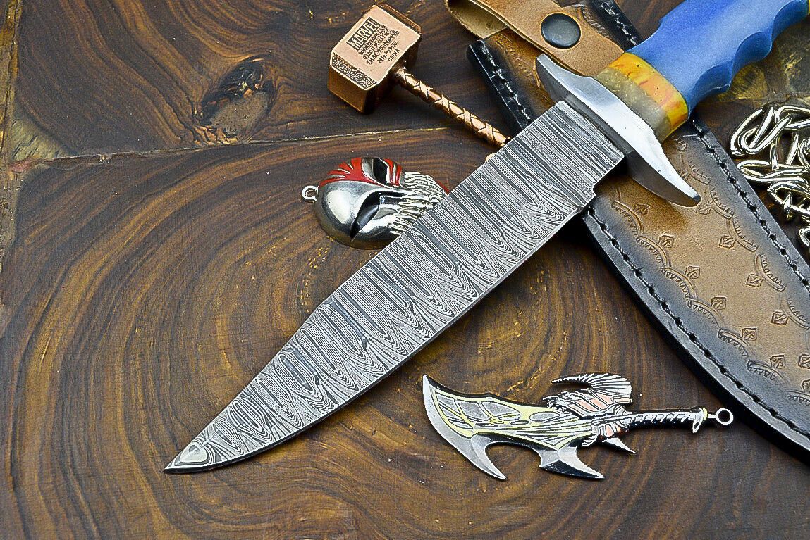 Heritage Forge 12 Inch Damascus Steel Hunting Knife with Resin Handle and Leather Sheath