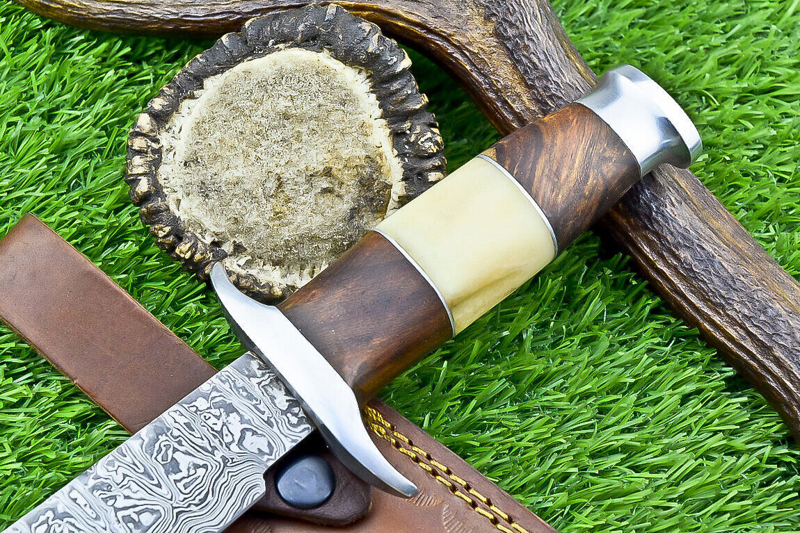 This knife features a 5-inch ergonomically contoured handle made from natural camel bone and hardwood, enhanced with a handmade steel bolster for added strength and balance. The full tang construction offers unmatched durability, while the custom leather sheath ensures safe, long-term storage and convenient carry.