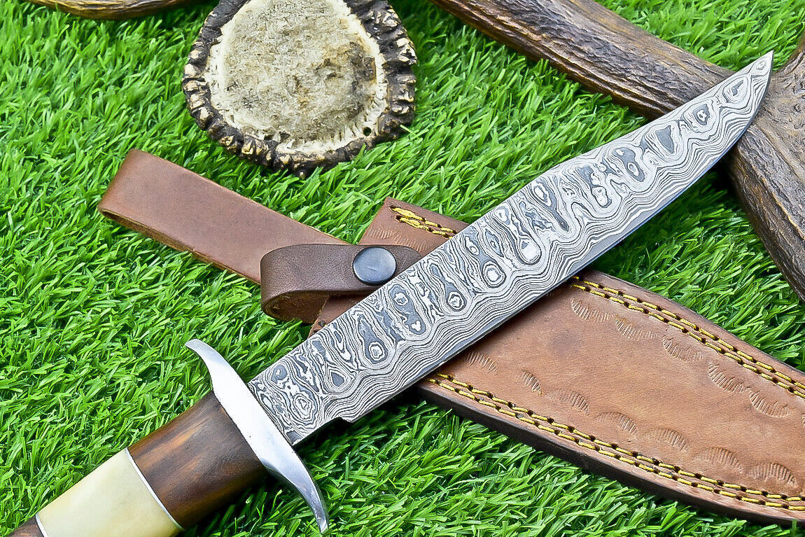 Heritage Forge 13 Inch Handmade Damascus Steel Bowie Knife with Camel Bone and Wood Handle and Leather Sheath