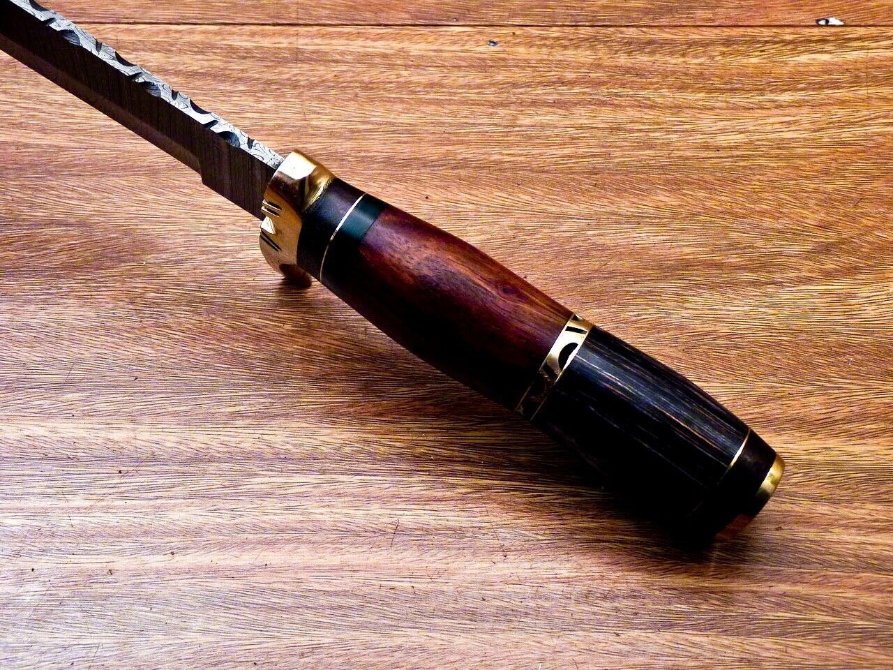 This Damascus camping knife has a beautifully crafted 5-inch handle, made from a blend of natural wood and hardwood, accented with brass spacers and a hand-cast brass bolster. The handle is both durable and visually striking, offering excellent grip and balance. Fine file work on the spine adds a touch of elegance to its rugged profile.