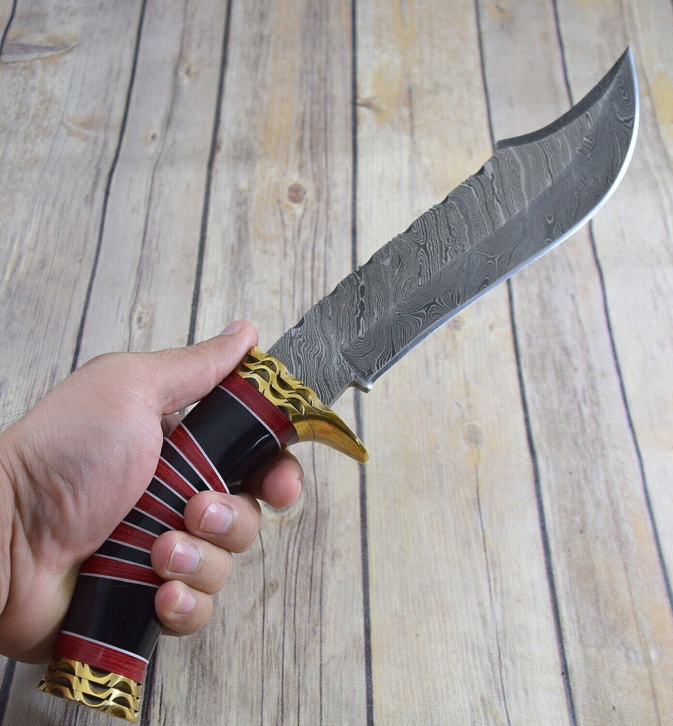 For display and safekeeping, the knife comes with a custom wooden stand, making it not only a reliable outdoor tool but a showpiece worthy of any collection. This fully functional Damascus Bowie knife is brand new in box and ready for use or display. A true must-have for collectors and adventurers alike.