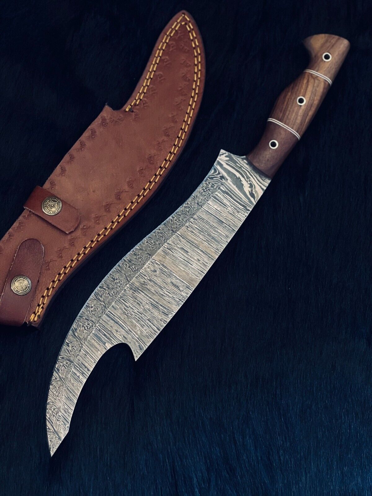 The Heritage Forge 15.5 Inch Fire Damascus Steel Machete Knife is an extraordinary tool designed for serious outdoorsmen and collectors. Hand forged using 512 true layers of high carbon 1095 and 15N20 steel, this full tang Damascus blade delivers superior cutting power and long-lasting edge retention. The aggressive fire-patterned blade features a 4 mm thickness, offering both durability and a unique visual appeal.