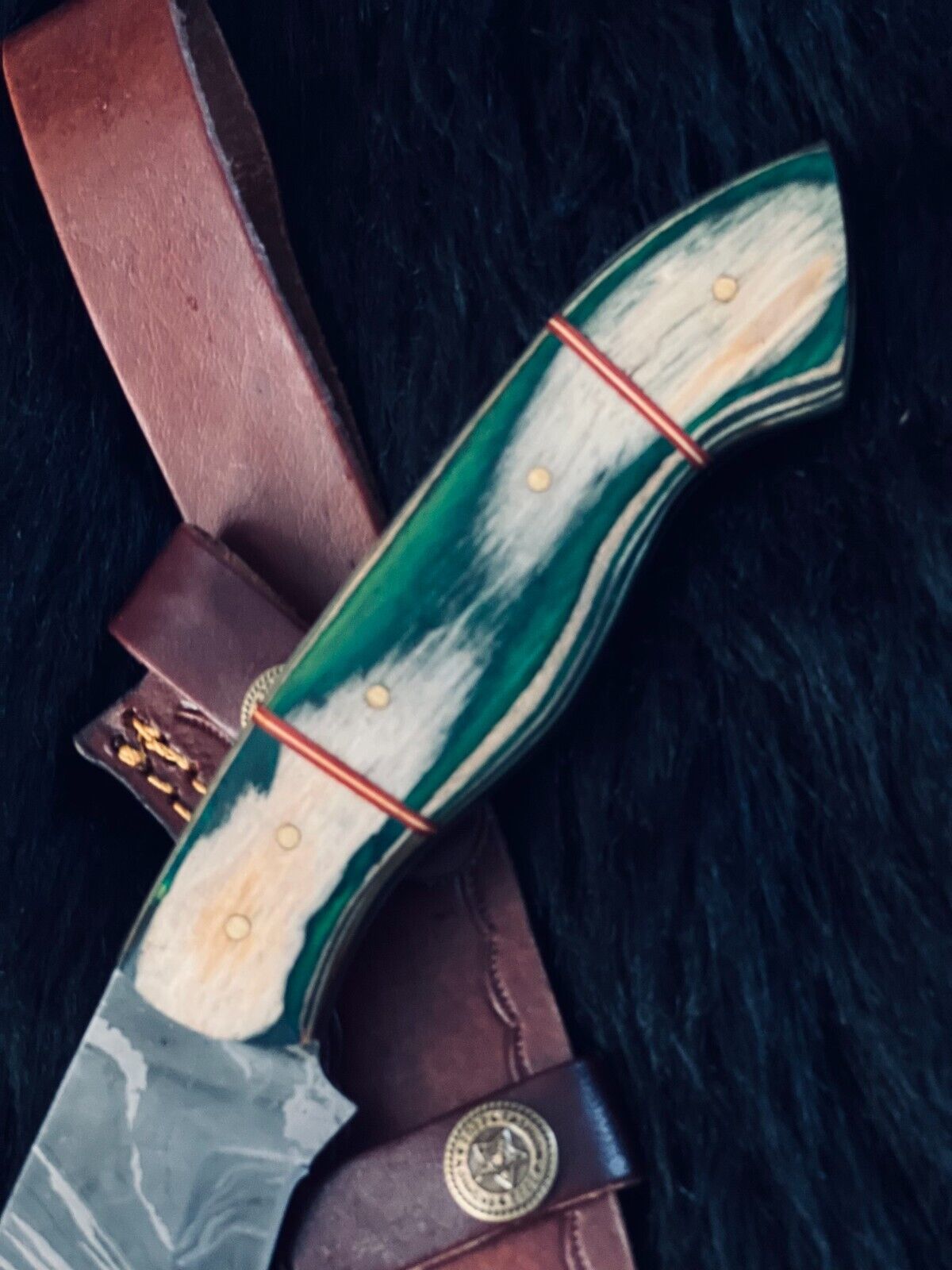 The handle combines stained camel bone and natural wood, further enhanced with brass spacers and a handmade Damascus steel bolster, providing a firm and comfortable grip. The spine is adorned with decorative file work, while the Rockwell hardness reaches 54 HRC at the edge, maintaining long-term sharpness even under rigorous outdoor use.