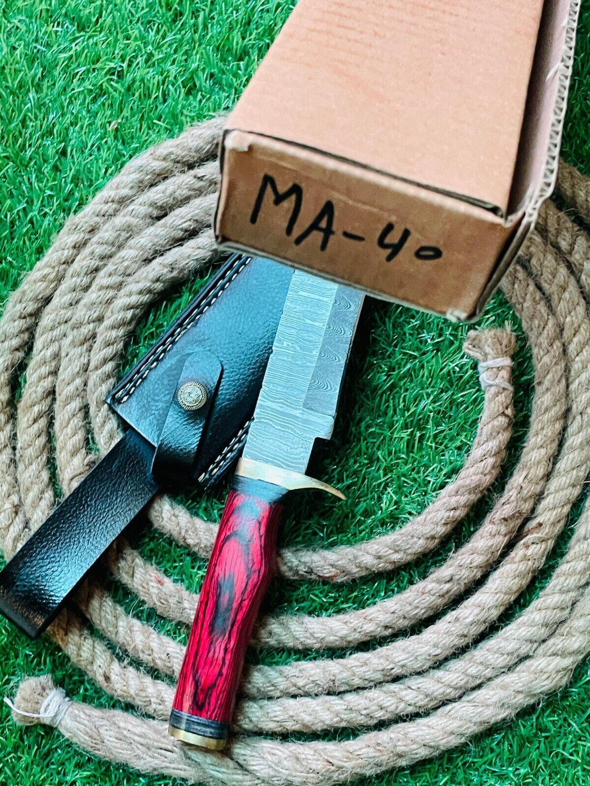 This 15 inch Damascus steel Bowie knife by Heritage Forge is a powerful and reliable tool built for hunting, camping, combat, and survival use. Hand-forged in Pakistan, it features a 10 inch drop point blade crafted from premium Damascus steel, offering outstanding edge retention and cutting performance. The 5 inch handle combines solid brass and natural wood, providing a balanced grip for both left- and right-handed users. A rat tail tang enhances durability, making this knife a rugged choice for heavy-duty tasks. The knife comes complete with a handcrafted leather sheath for secure carrying. Whether for outdoor use or collection, this Bowie knife is a standout piece of craftsmanship.