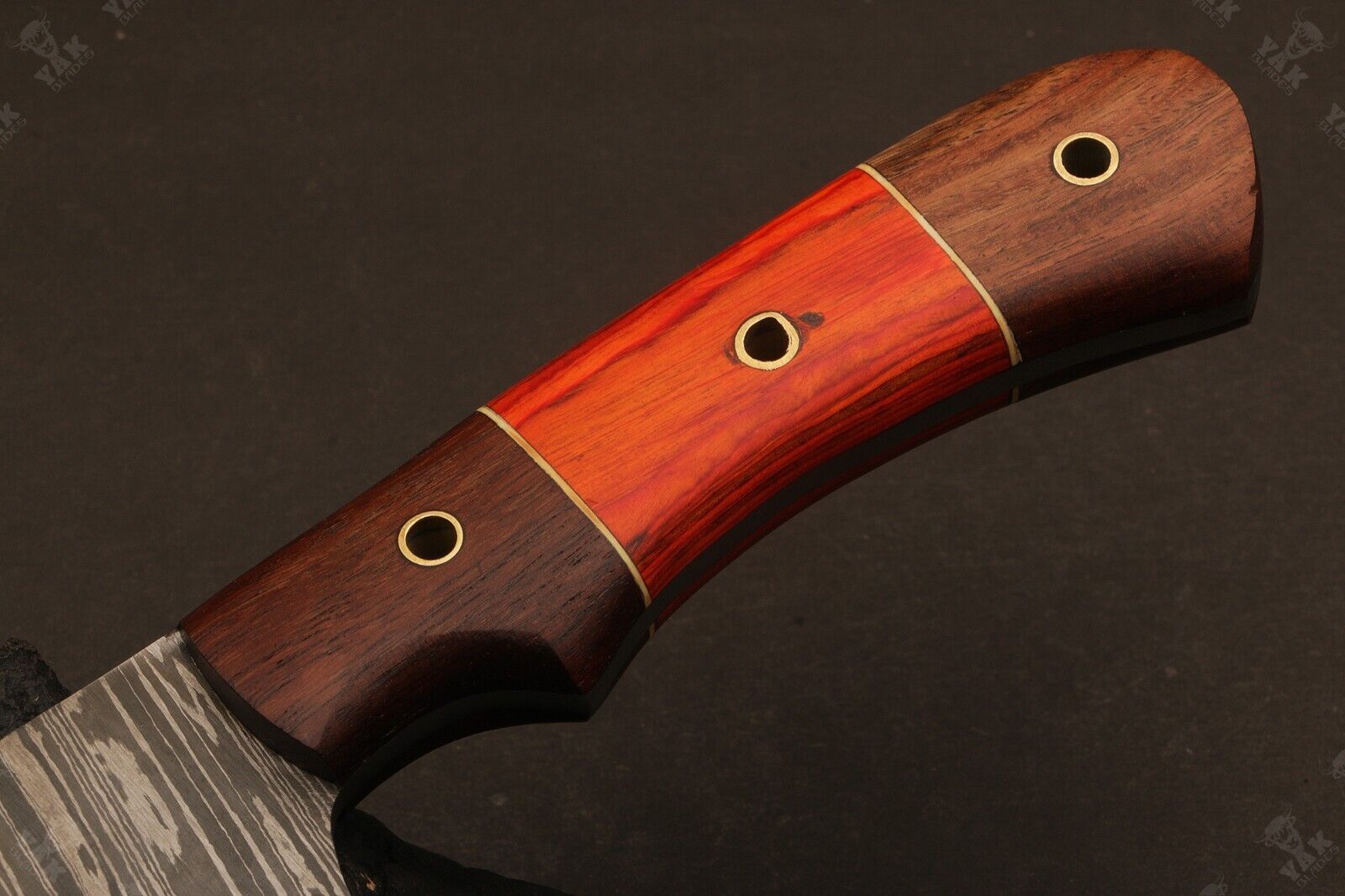 The handle is made from stained camel bone and natural wood, accented by brass spacers and a forged damascus steel bolster. This combination delivers a stunning look and a sturdy grip, ensuring the knife feels balanced and secure in your hand.