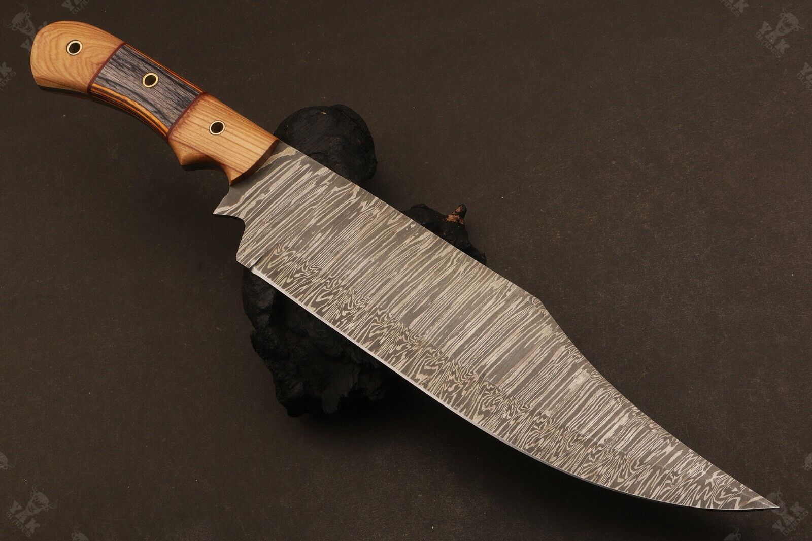 Heritage Forge 15 Inch Fire Damascus Steel Bowie Knife with Wood Handle for Hunting and Camping