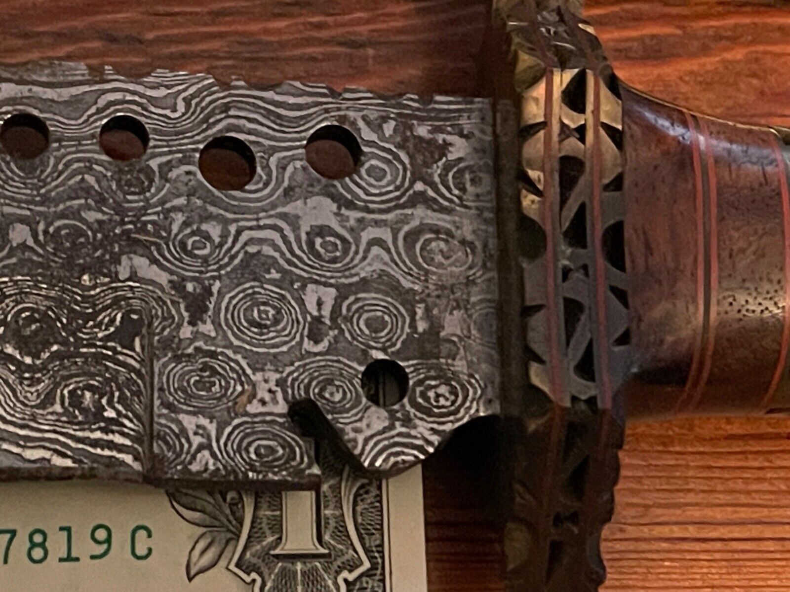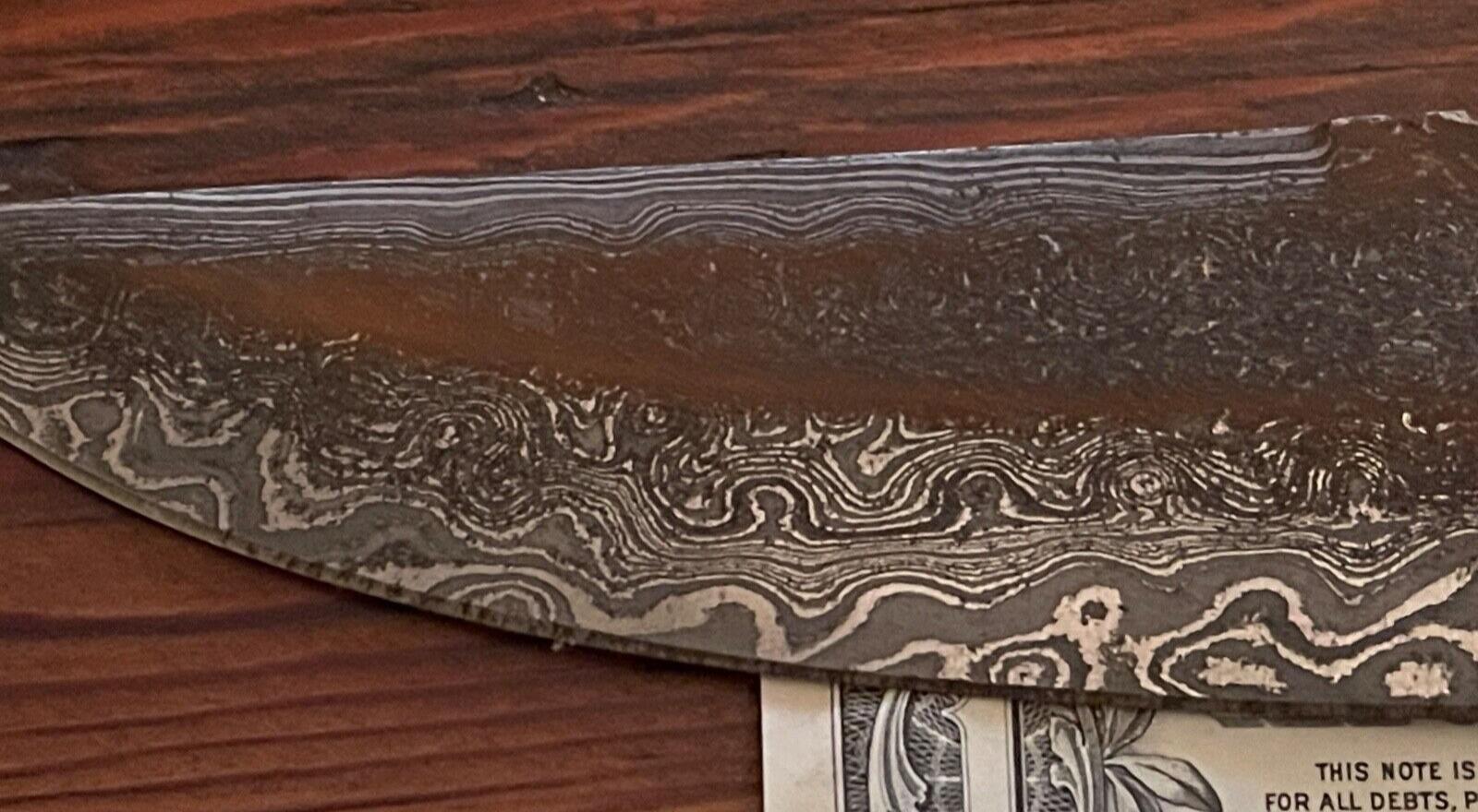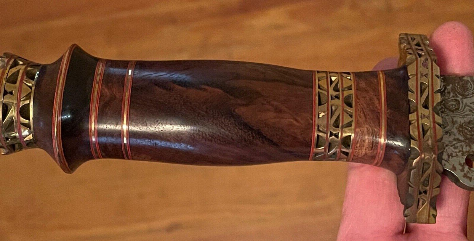 The 9 inch Damascus blade is complemented by a full tang construction and a natural wood handle, ergonomically shaped for a comfortable grip. The handle is secured with a solid brass guard and accents, showcasing traditional craftsmanship. Please note: the brass components may have minor oxidation due to age, and the blade may display light surface rust from storage—both adding to its authentic vintage charm and potential for restoration.