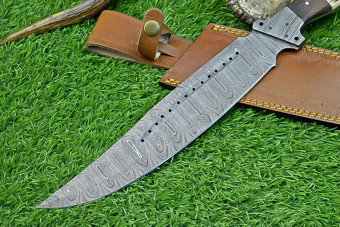 The Heritage Forge 16 Inch Custom Handmade Damascus Bowie Knife is a stunning fusion of craftsmanship and utility—perfect for hunting, camping, survival, and collectors alike. Forged from a blend of 1095 high carbon steel and 15N20 nickel steel, the blade undergoes a meticulous folding process, producing 384 visible Damascus layers with strength, sharpness, and beauty in every detail. The blade is acid-etched to reveal bold patterns and finished with a satin-sharp edge.