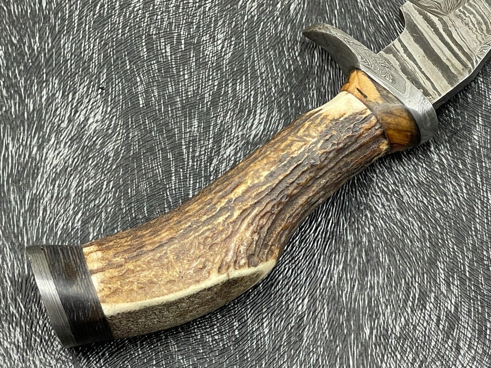 The handle is made from genuine stag horn and hardwood scales, secured with a stunning Damascus bolster, providing a firm grip and striking appearance. The spine features intricate file work, while the knife’s balance ensures precision and comfort during use.