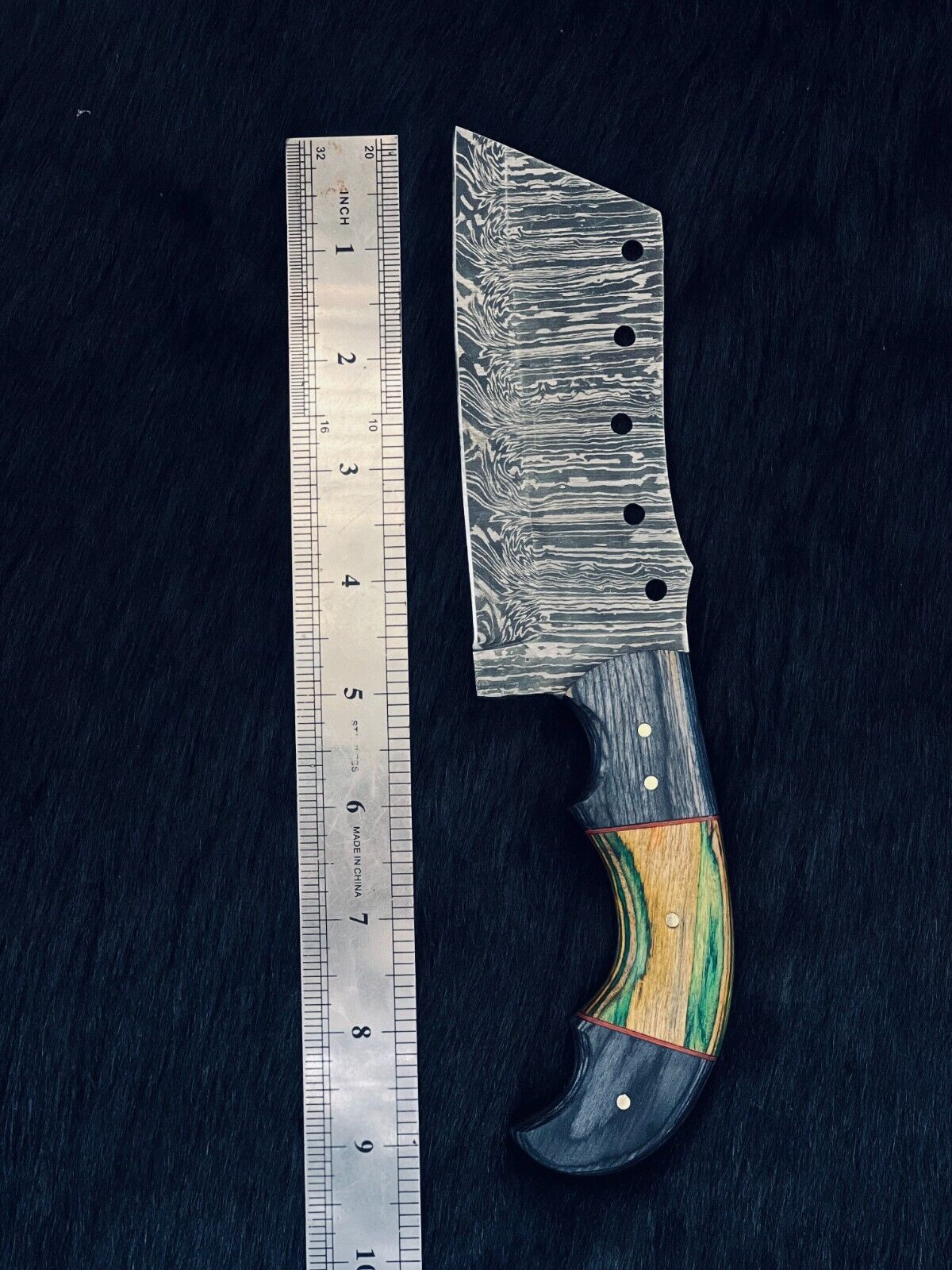 Perfect for hunting, camping, and outdoor use, this cleaver knife is built for rugged performance. It features a 5.25-inch full tang blade that’s 4 mm thick, heat-treated for superior strength, and achieves a Rockwell hardness rating of 54 HRC along the edge and 42–45 HRC at the spine. The 4.25-inch handle is crafted from stained camel bone and natural wood, separated by brass spacers and completed with a handmade Damascus steel bolster for added balance and aesthetic appeal.