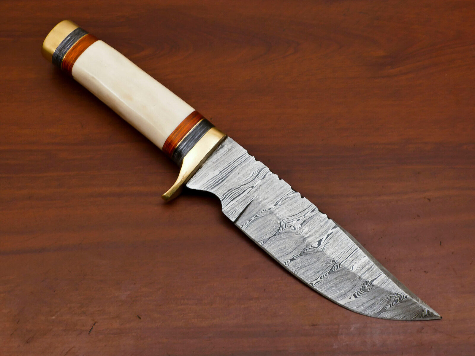 Heritage Forge Custom Damascus Steel Bowie Knife with Camel Bone and Pakka Wood Handle for Hunting and Camping