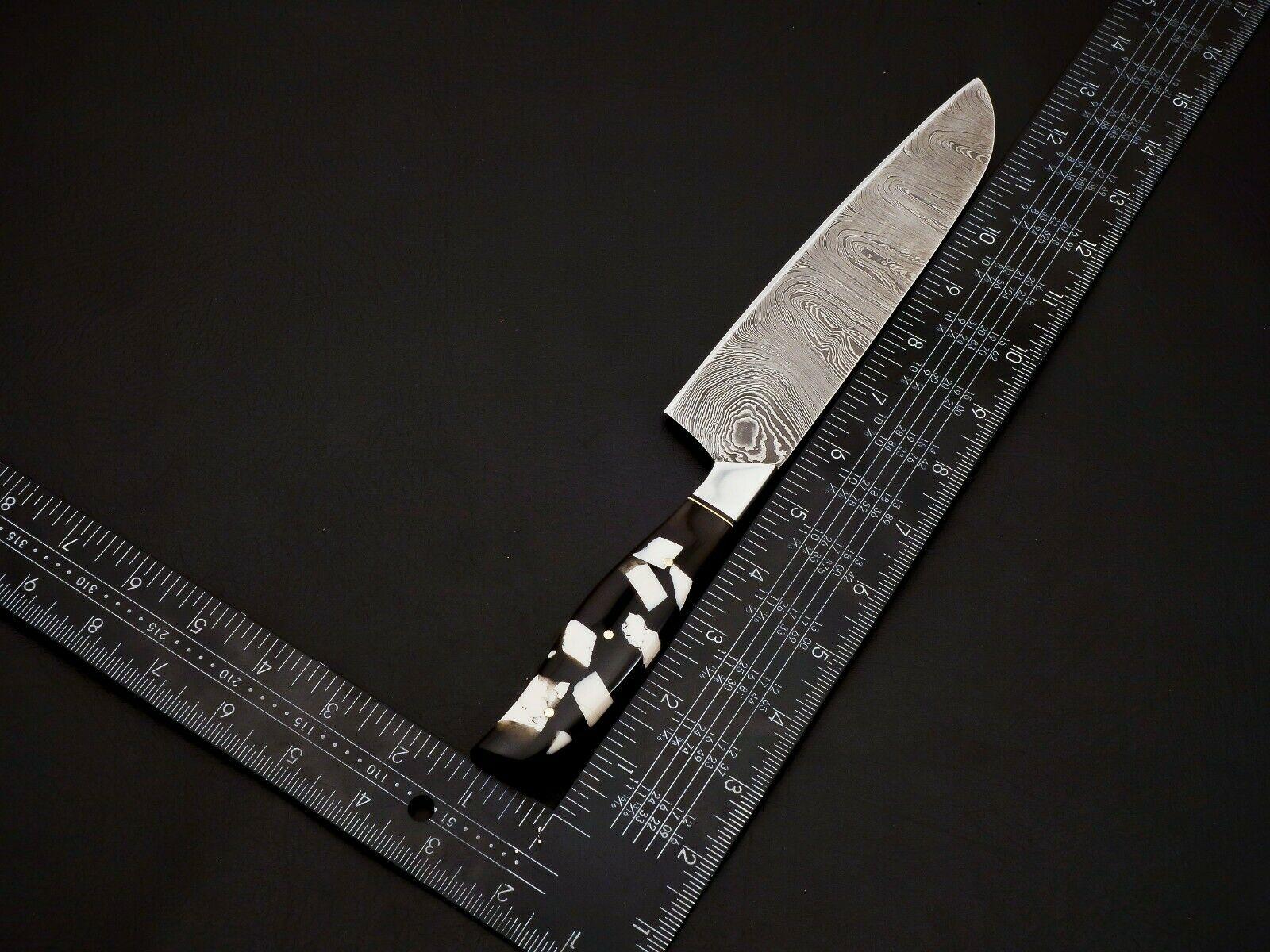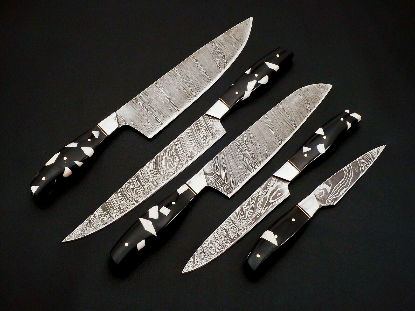 Unique & Rare Heritage Forge Custom Damascus Steel Hand Forged Full Tang Chef Knife Set with Beautiful Resin Handles and Stainless Steel Bolsters – PT-037. The exact items shown in the photos will be received. Each blade is made from a Damascus steel combination of 1095 and 15N20, folded repeatedly to create a stunning pattern with a minimum of 288 layers. The acid etching brings out the layers beautifully while sharpening the edge to razor perfection.