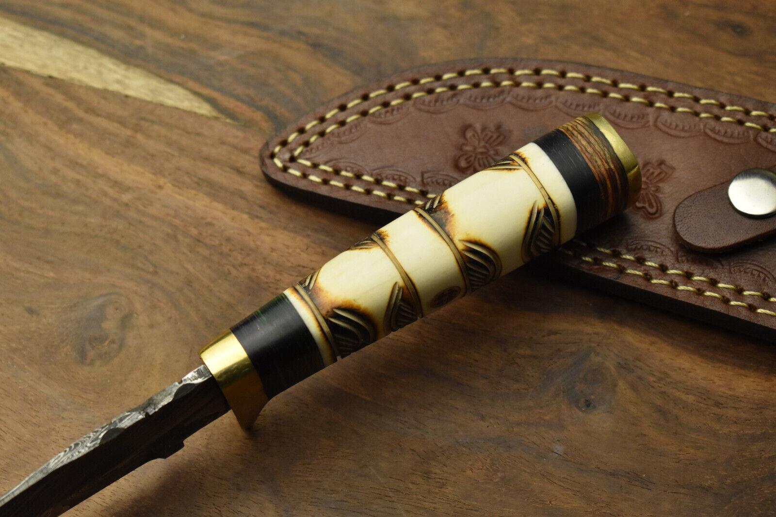 Heritage Forge Damascus Steel Bowie Knife with Camel Bone Handle for Hunting and Survival