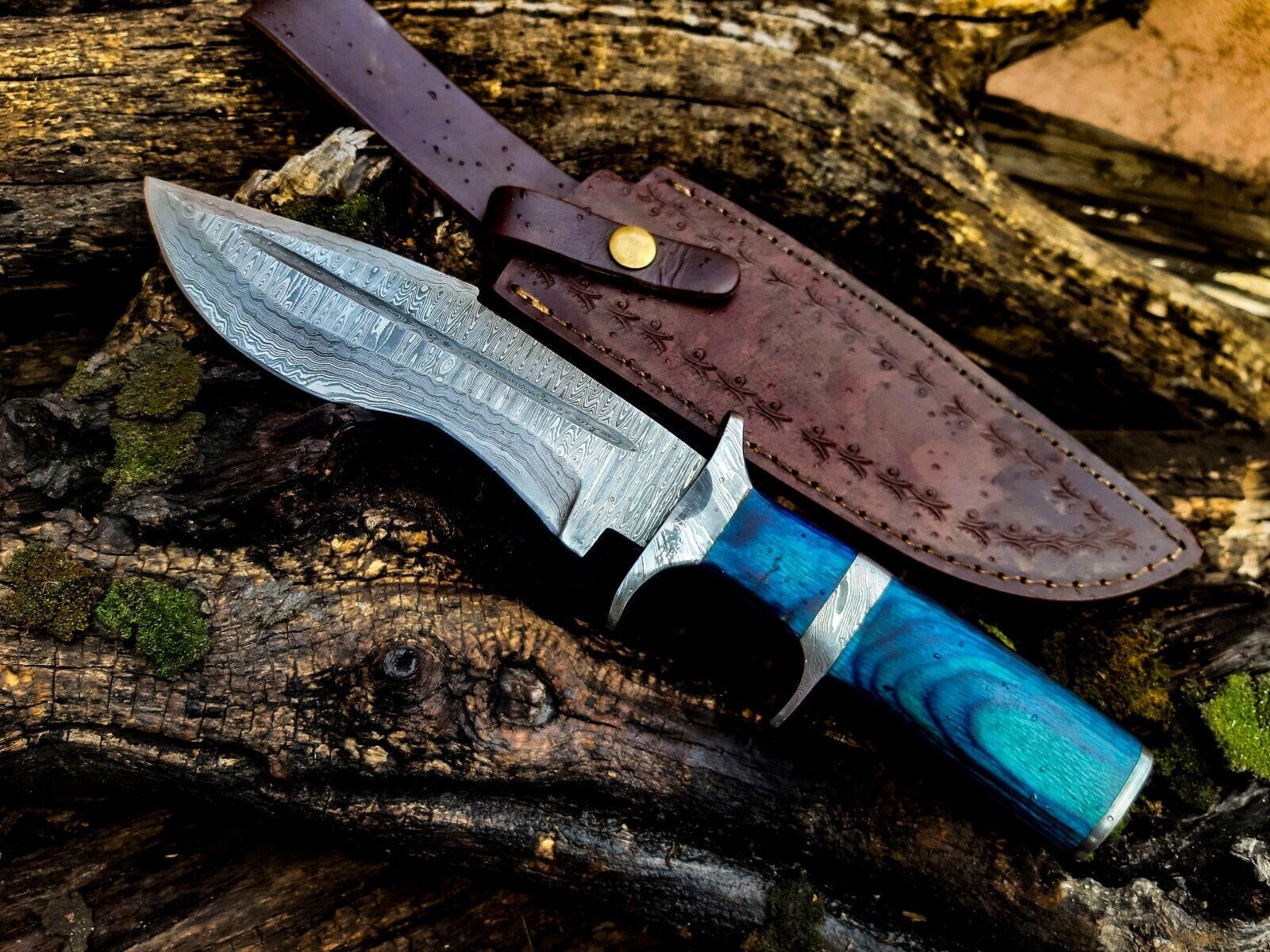 Elevate your outdoor experience with the Handmade Damascus Steel Hunting Bowie Knife featuring a striking Blue Wood handle and secure leather sheath. Expertly hand-forged from premium Damascus steel, this knife showcases 512 layers of high and low carbon steel for exceptional strength and a unique pattern on every blade. With a full tang construction and a razor-sharp drop point blade, it’s engineered for hunting, survival, and camping use. The ergonomic Blue Wood handle offers a solid grip and visual appeal, while the durable leather sheath ensures safety and portability. Whether you’re a seasoned hunter or a knife collector, this Bowie knife combines tradition, performance, and craftsmanship. Handmade in Pakistan, this is an original piece designed for both function and admiration.